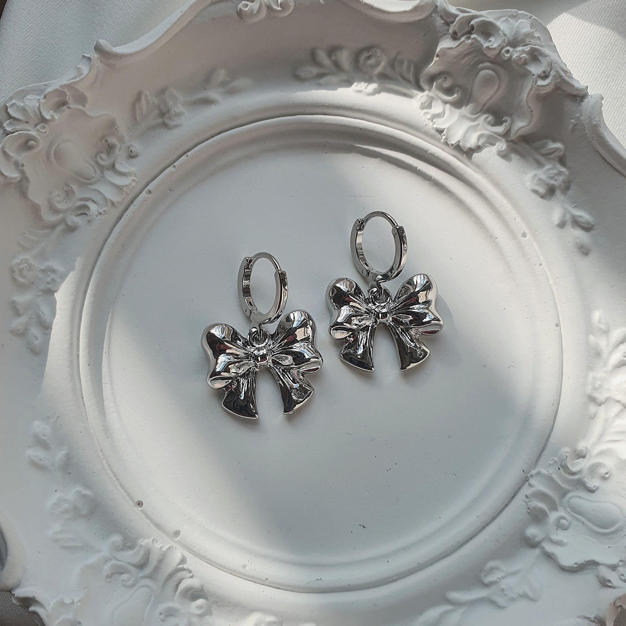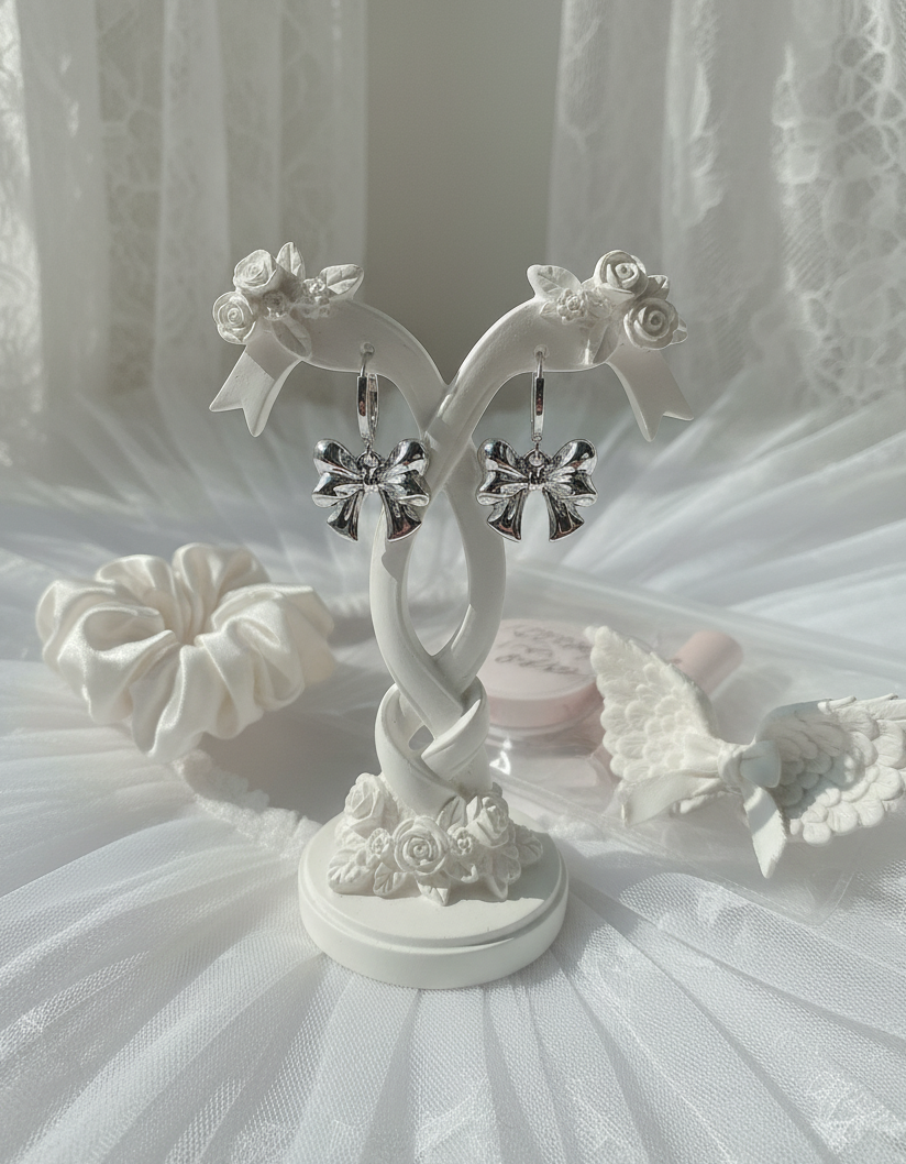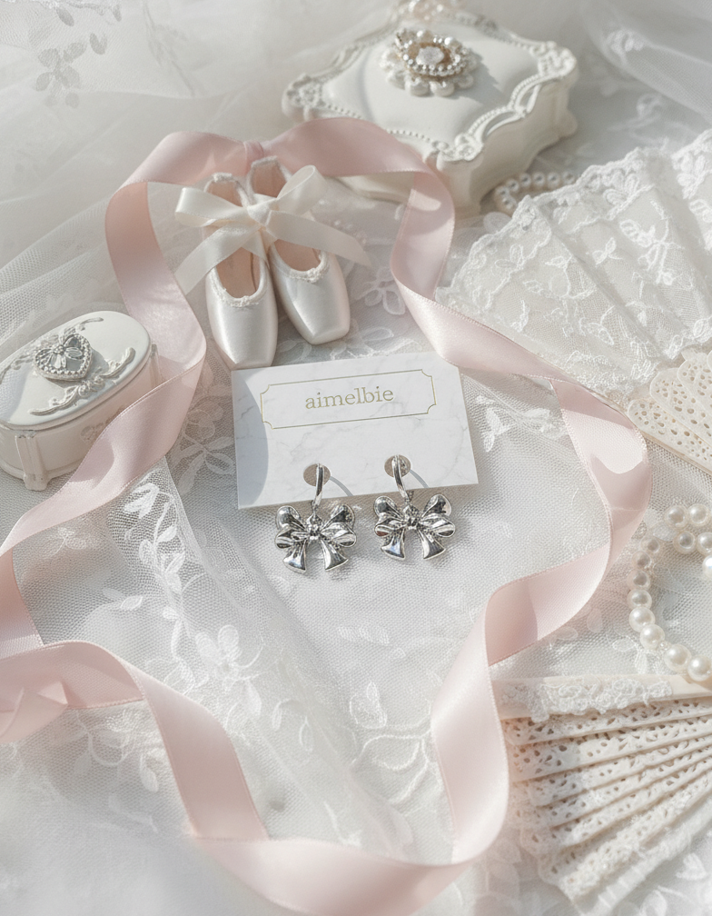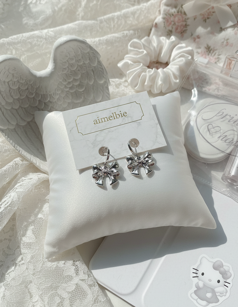 A pair of adorable huggies earrings with voluminous silver ribbon pendants dangling. They are lovely, cute, and chic. They are perfect for a daily use, yet will bring a noticeable girlish charm to your everyday look.
