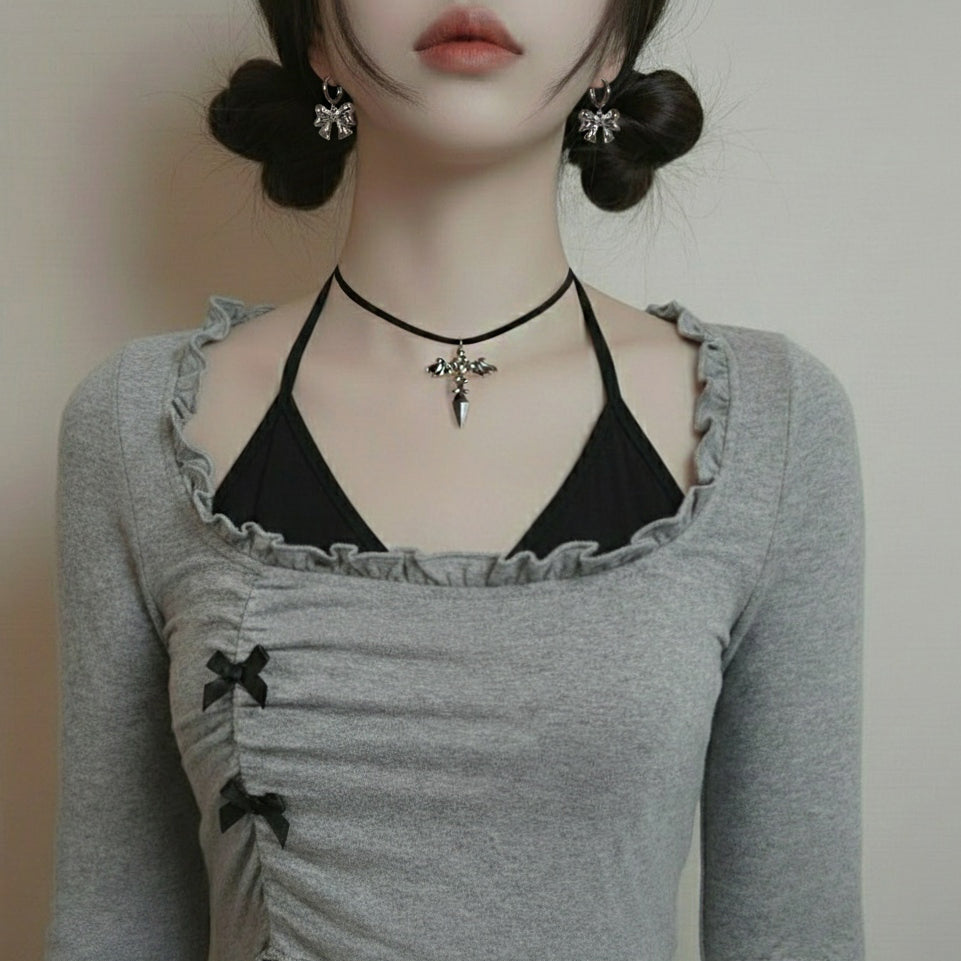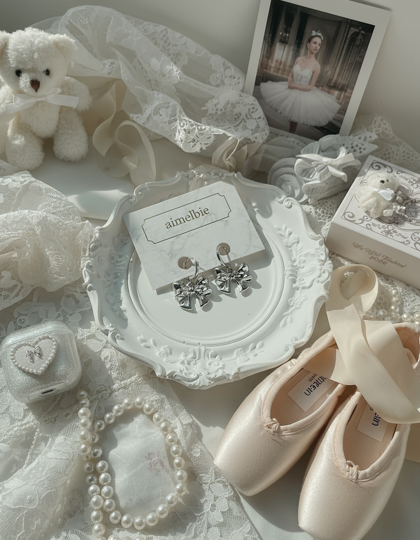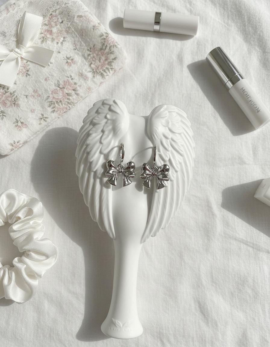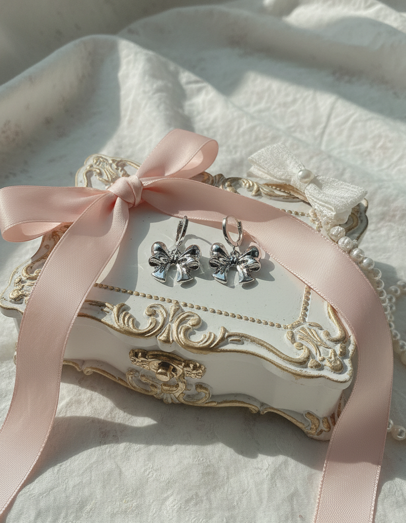 A pair of adorable huggies earrings with voluminous silver ribbon pendants dangling. They are lovely, cute, and chic. They are perfect for a daily use, yet will bring a noticeable girlish charm to your everyday look.