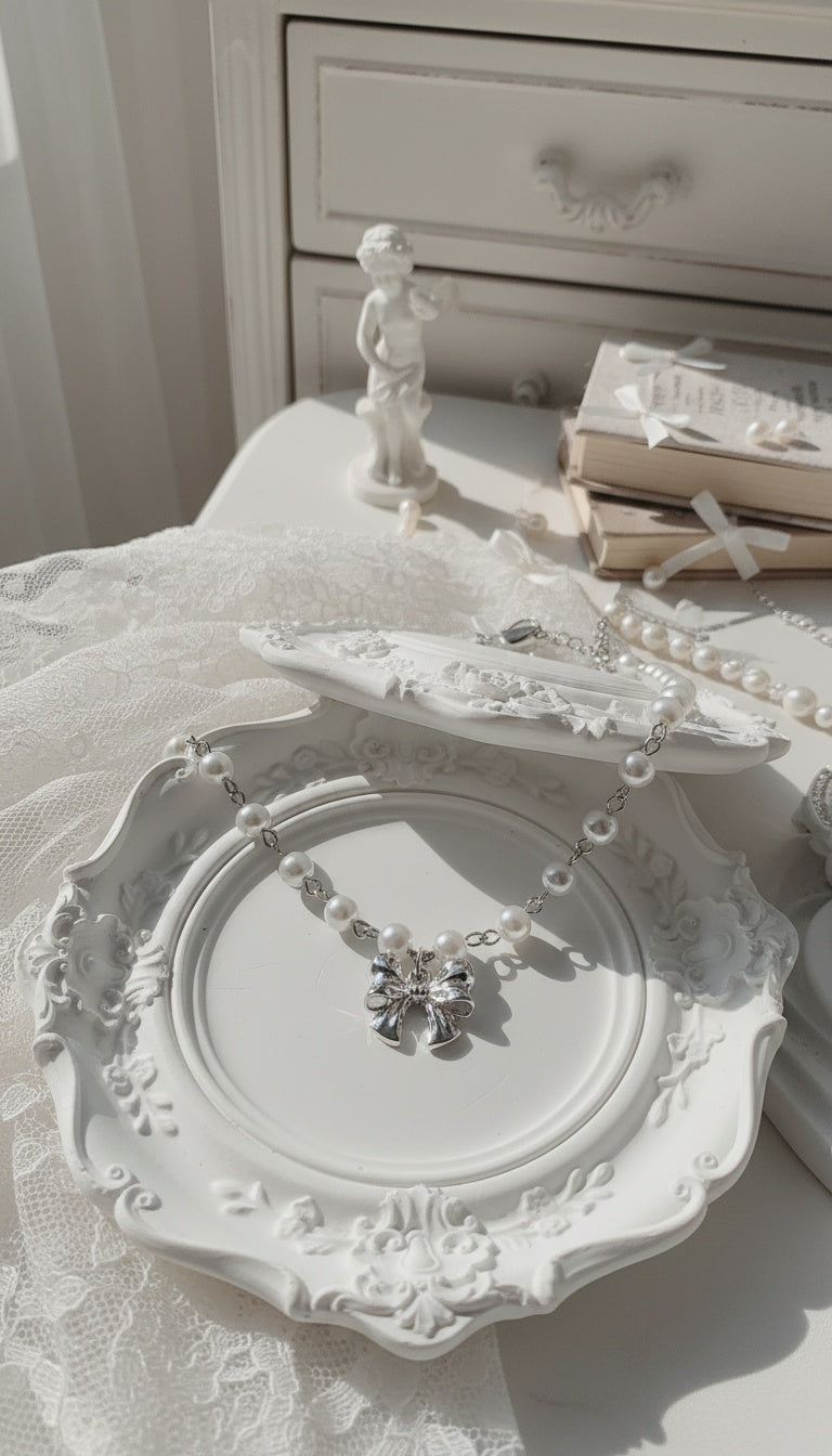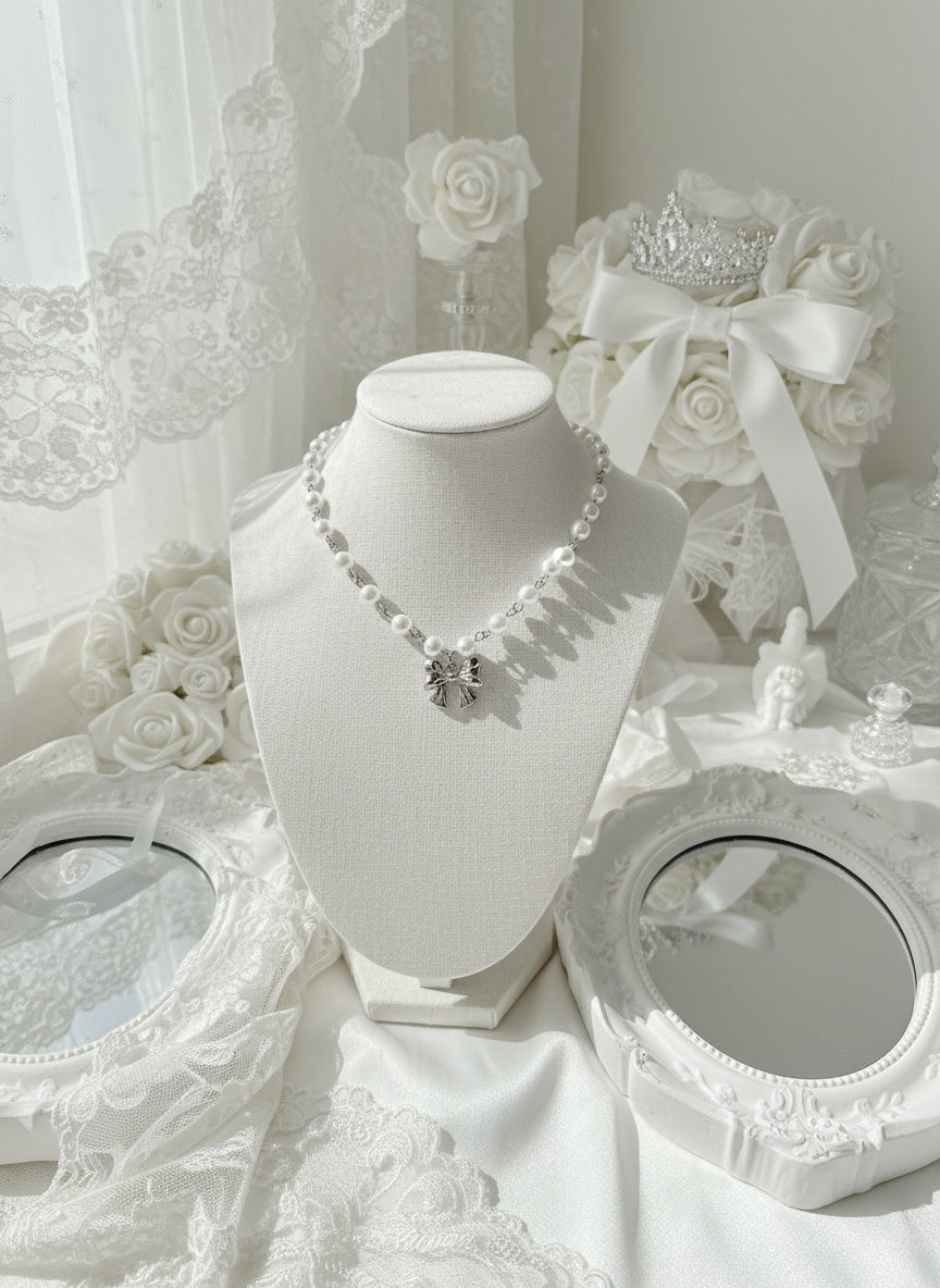 This adroable choker with bold pearl chains and a voluminous silver ribbon pendant will add a lovely shimmer to your look. They are luxurious and cute at the same time.