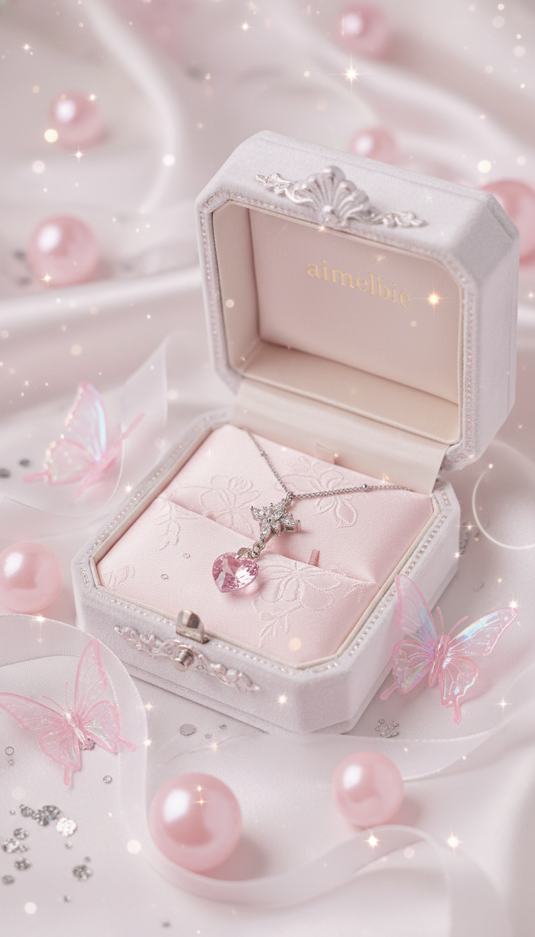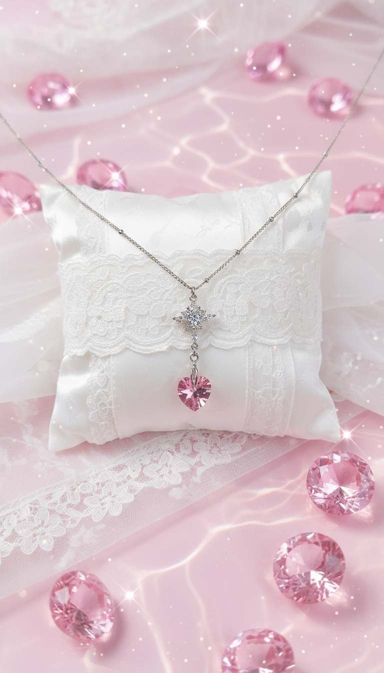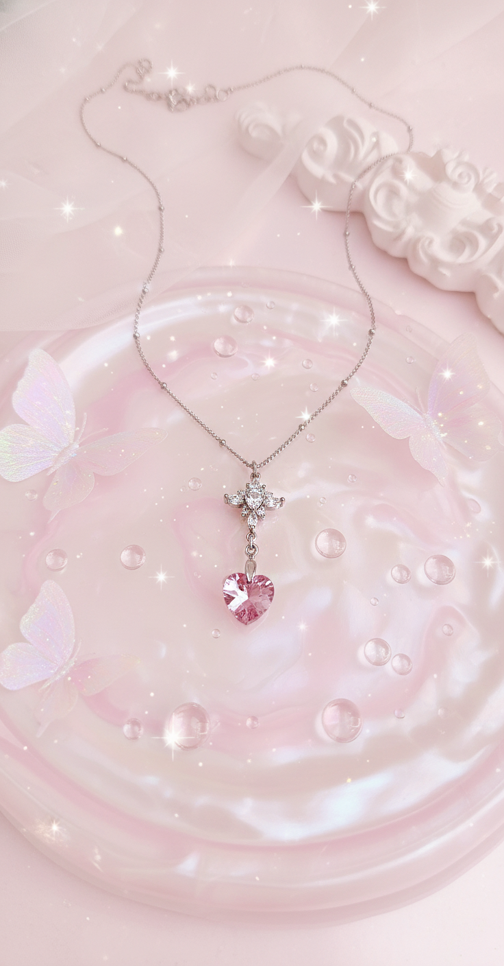 Bring a dainty shimmer and sparkle to your look with this necklace. Adorned with a pendant that consists of a beautiful connector that resemble angel wings(which are delicately set with Cubic Zirconia stones), and a heart-shaped Pink AB colored Swarovski crystal, they will bring that significant bling to your look everytime they dangle by your chest.