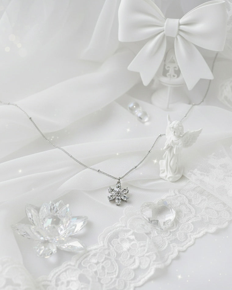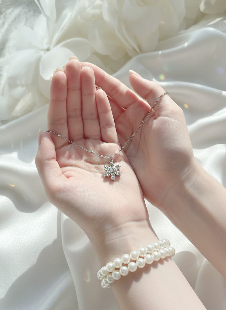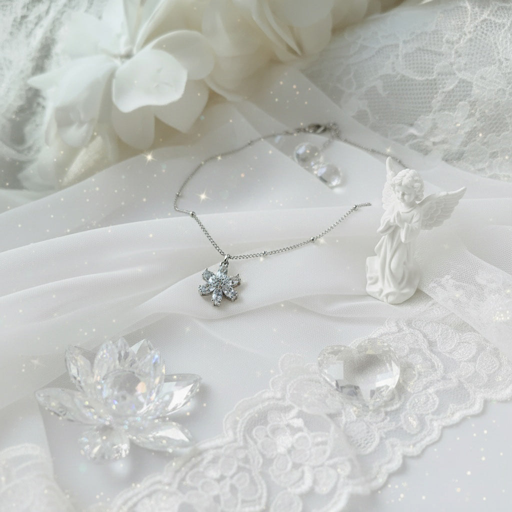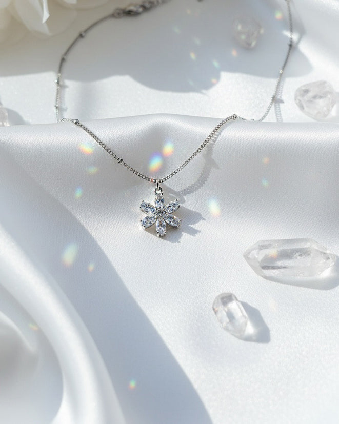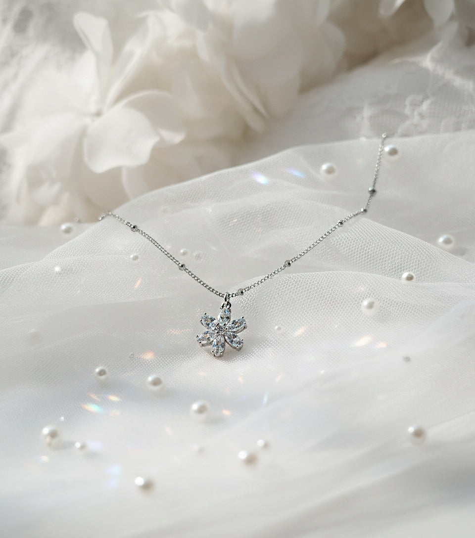 A beautiful flower with sparkling petals has found its way onto your neck! This handmade semi-choker necklace simply goes with everything - from elegant looks to everyday outfits. The length of the chain choker is slightly more loose than regular chokers, which is around 33.5 cm.