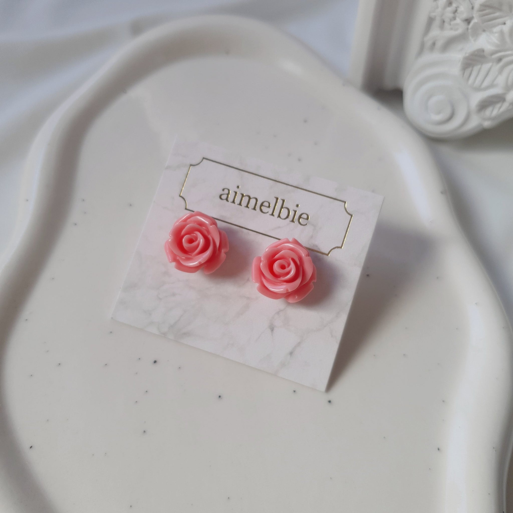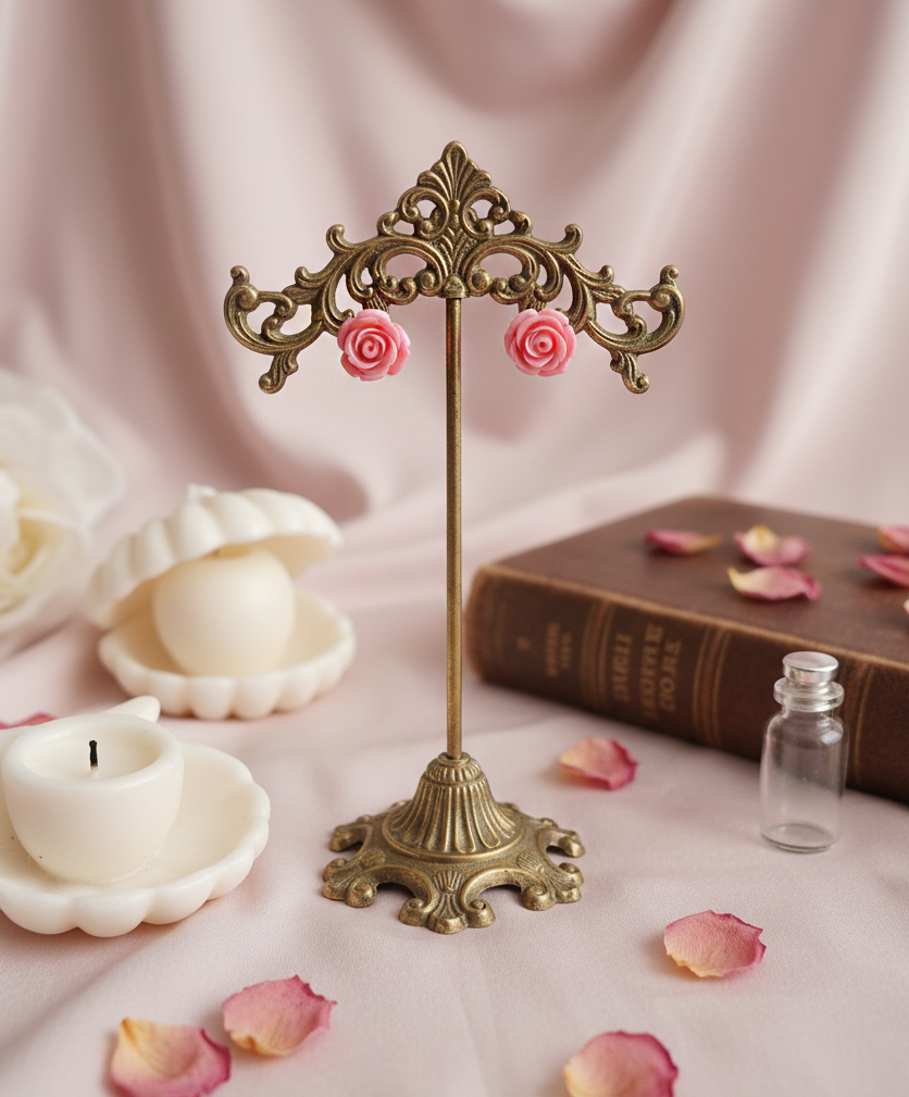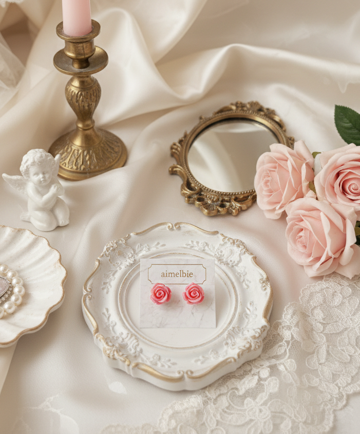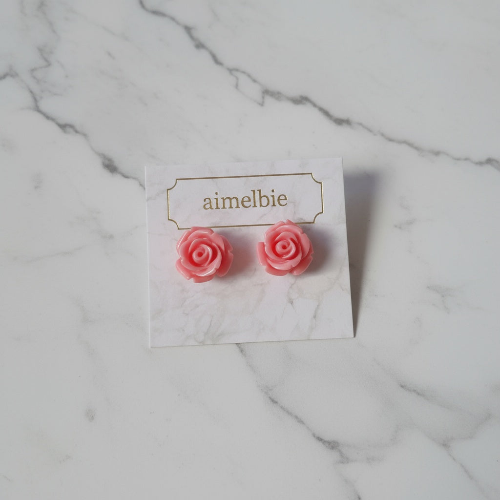 These daily stud earrings feature a beautifully vibrant pink rose cabochon. An exclusive design by aimelbie, this piece boasts a unique vintage-inspired charm. Perfect for adding a subtle touch of loveliness without going over the top.