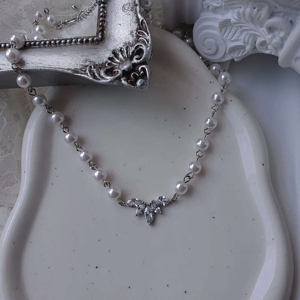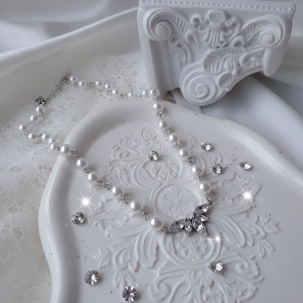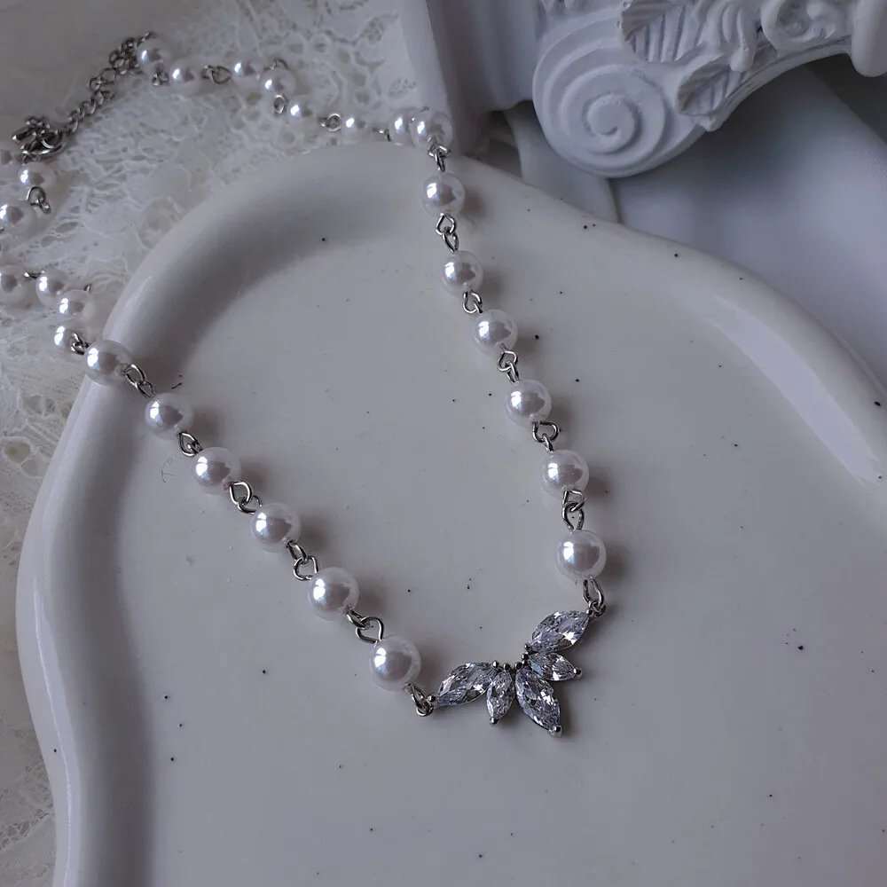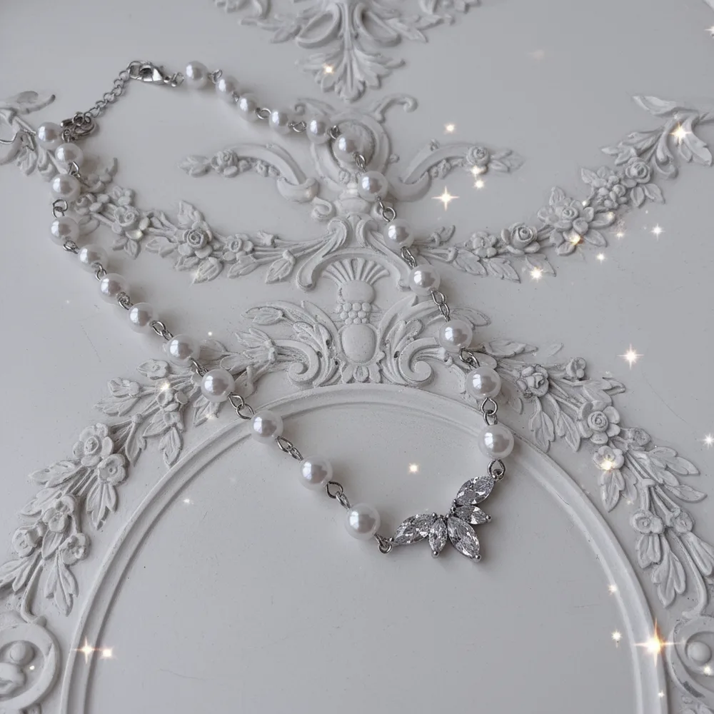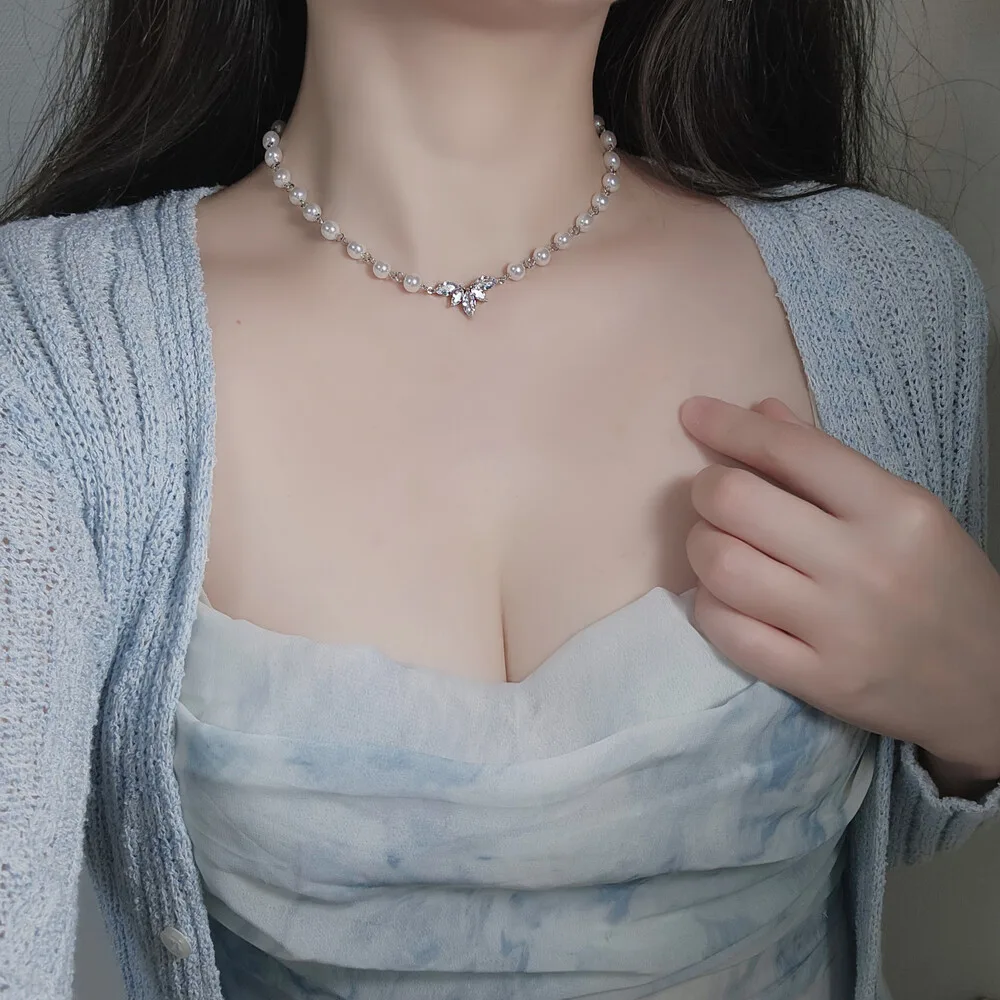 Exquisitely crafted with cubic zirconia crystals, this pearl choker necklace features a high-quality connector shaped like angel wings, creating a luxurious and elegant aesthetic.