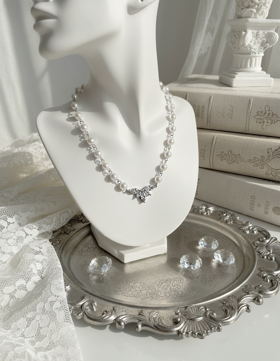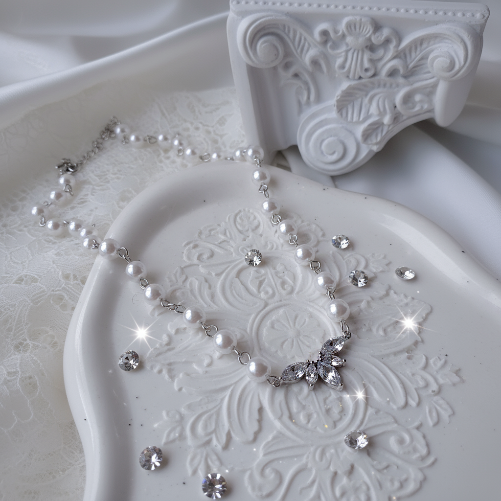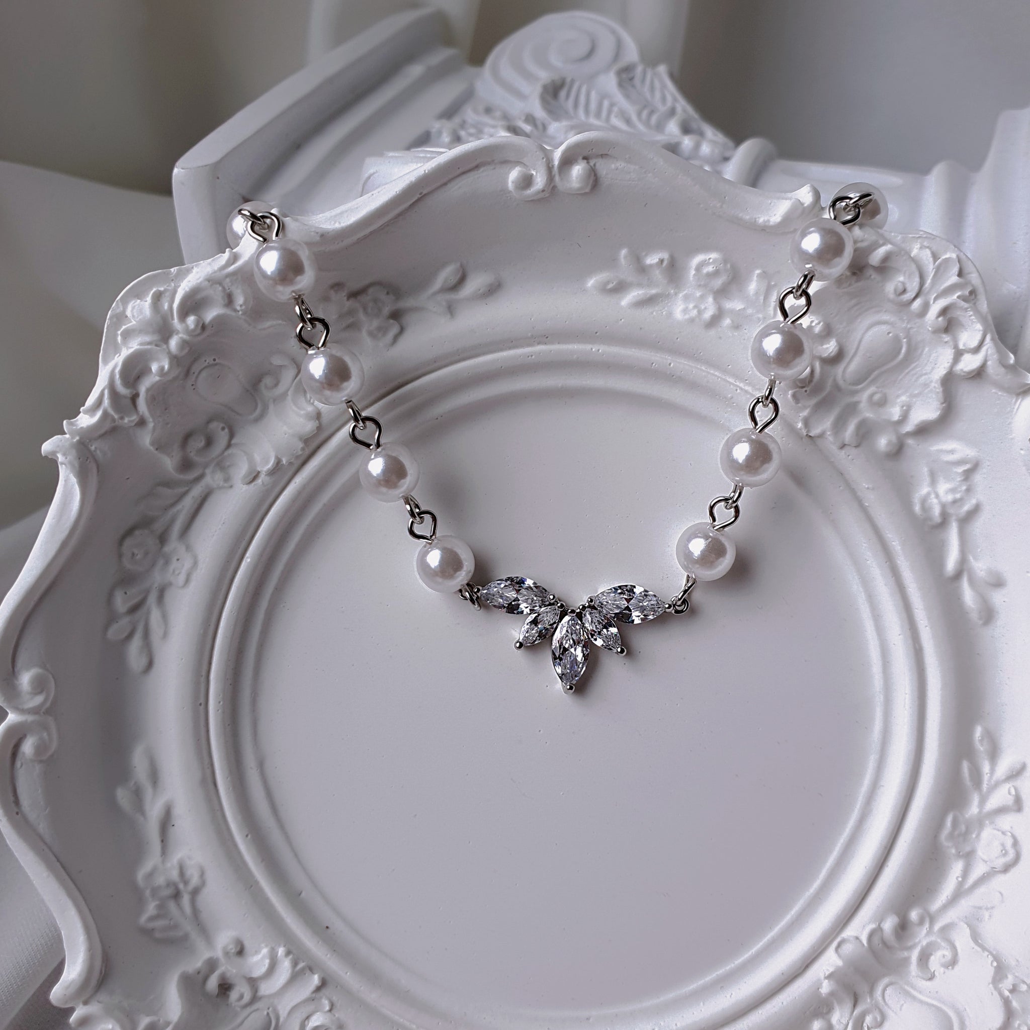 This pearl choker necklace features delicately crafted cubic zirconia crystals and a high-quality connector designed to resemble angel wings, offering a luxurious and elegant look.