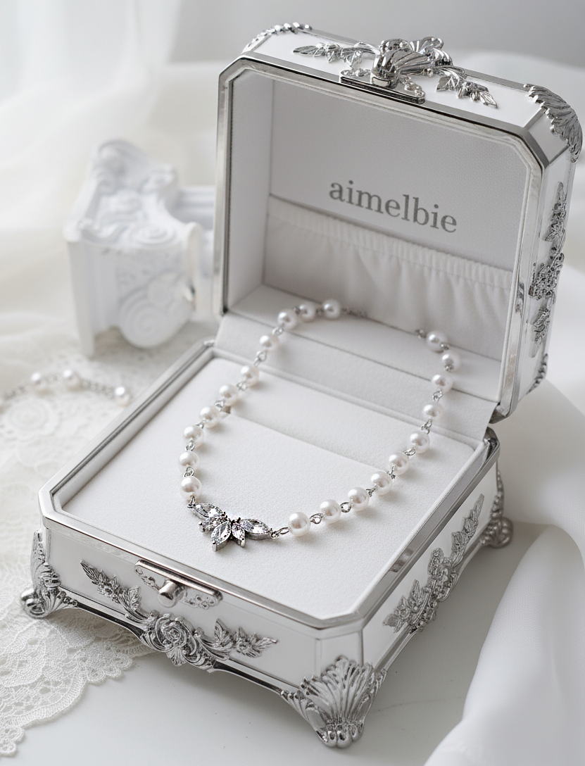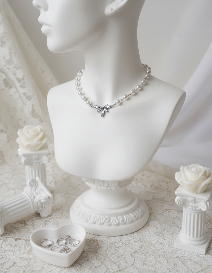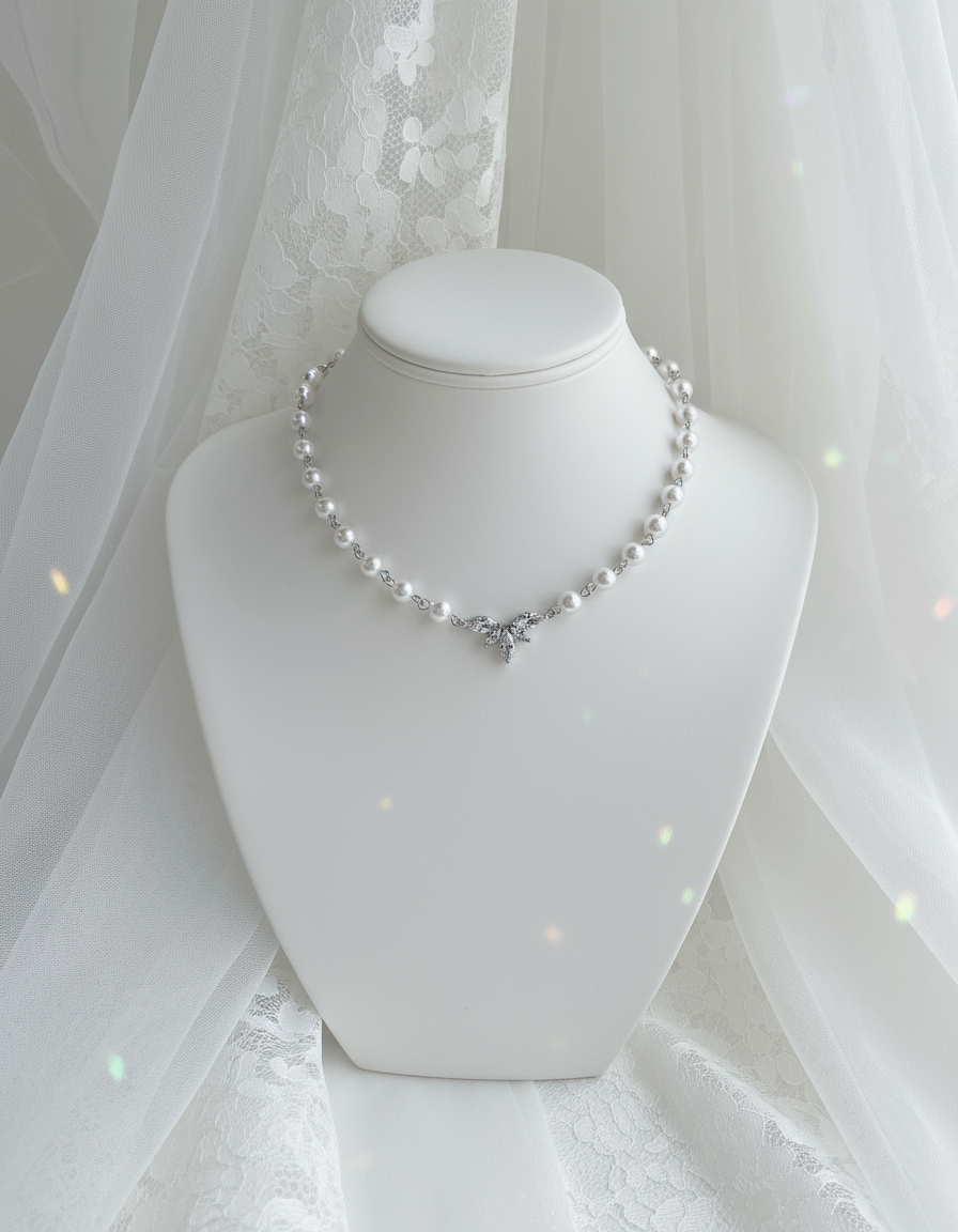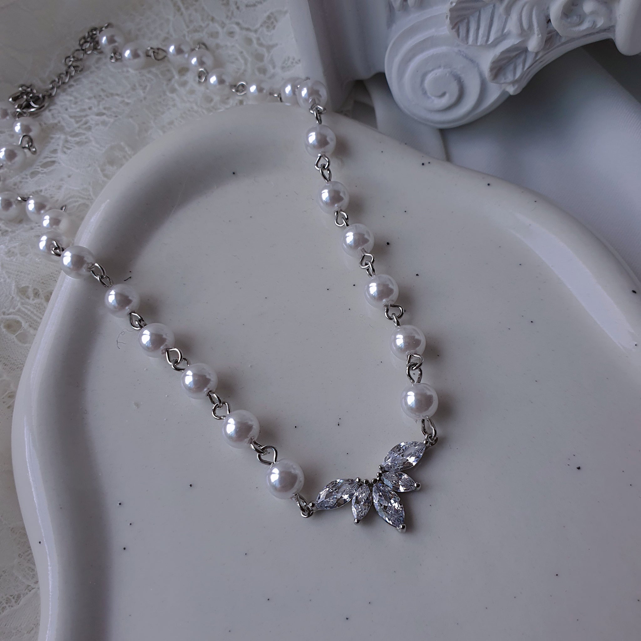 This pearl choker necklace features delicately crafted cubic zirconia crystals and a high-quality connector designed to resemble angel wings, offering a luxurious and elegant look.