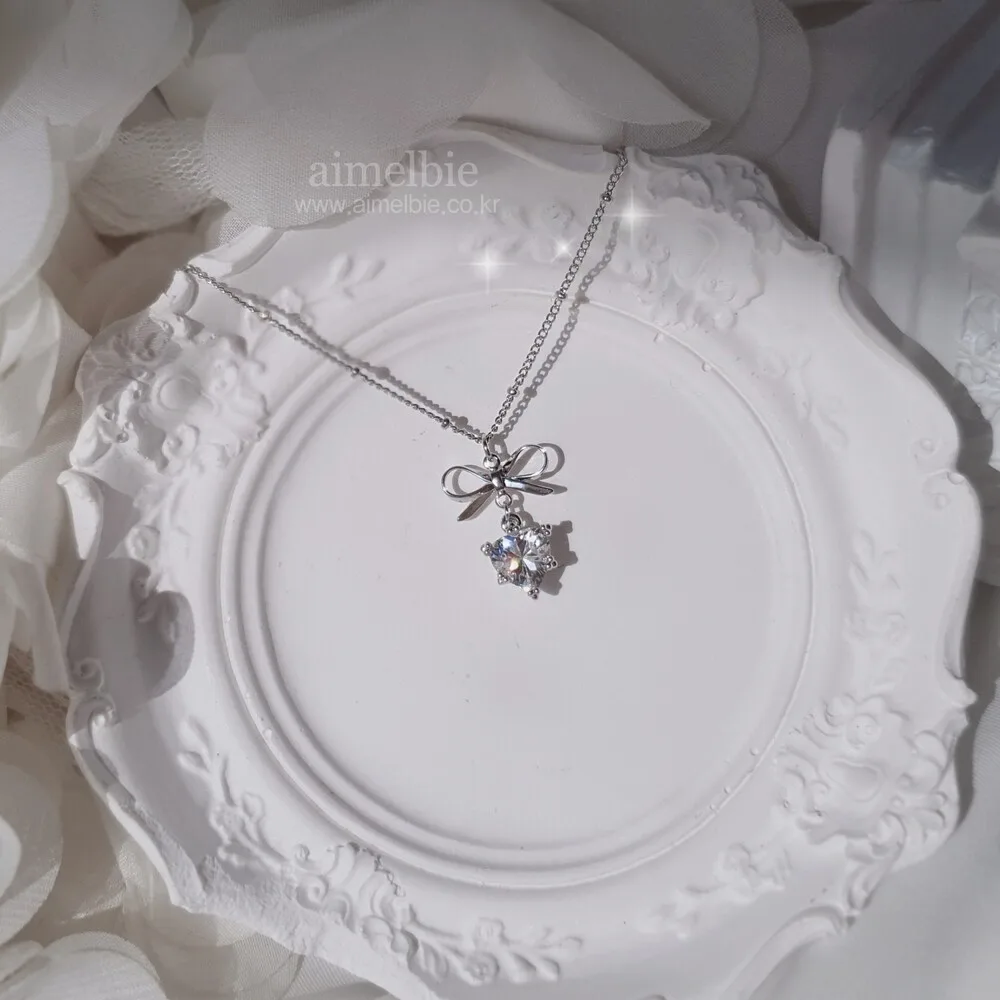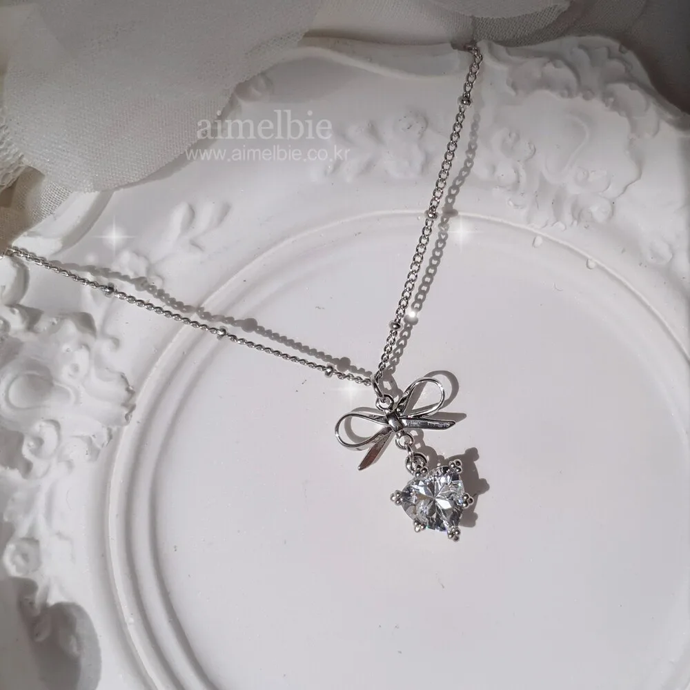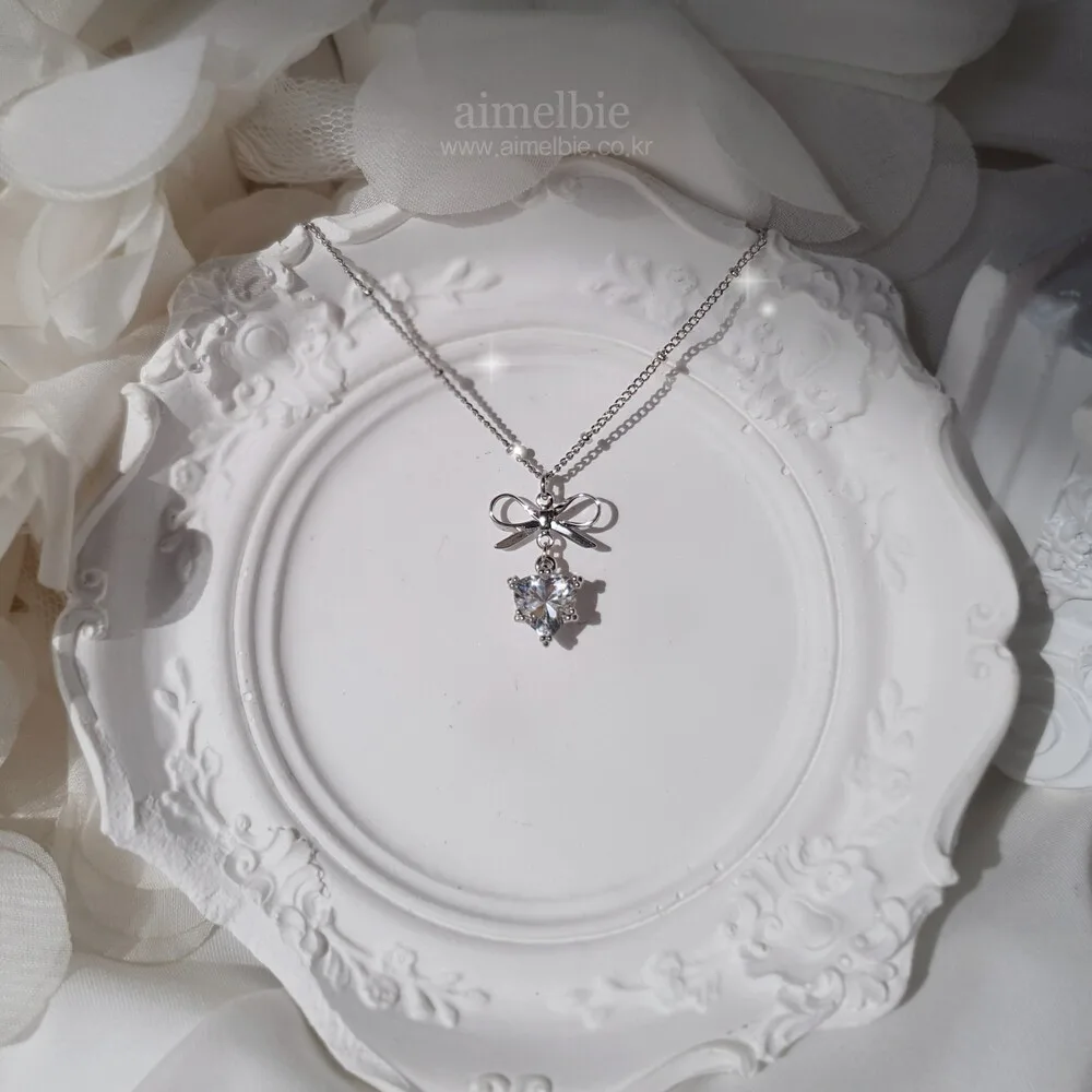 Dainty Ribbon and Heart Semi Choker Necklace - Silver Color