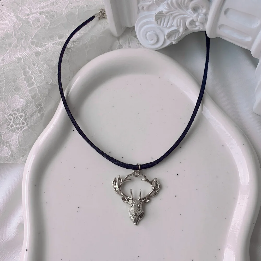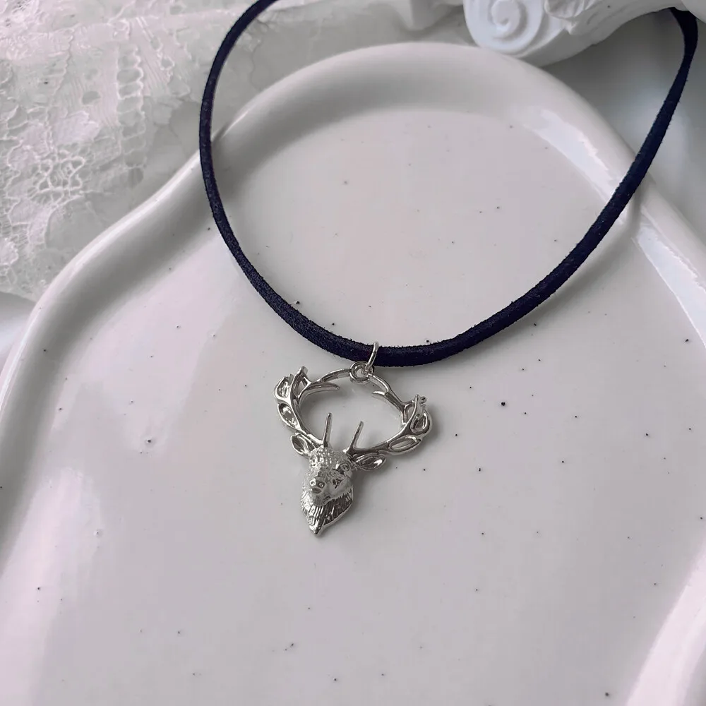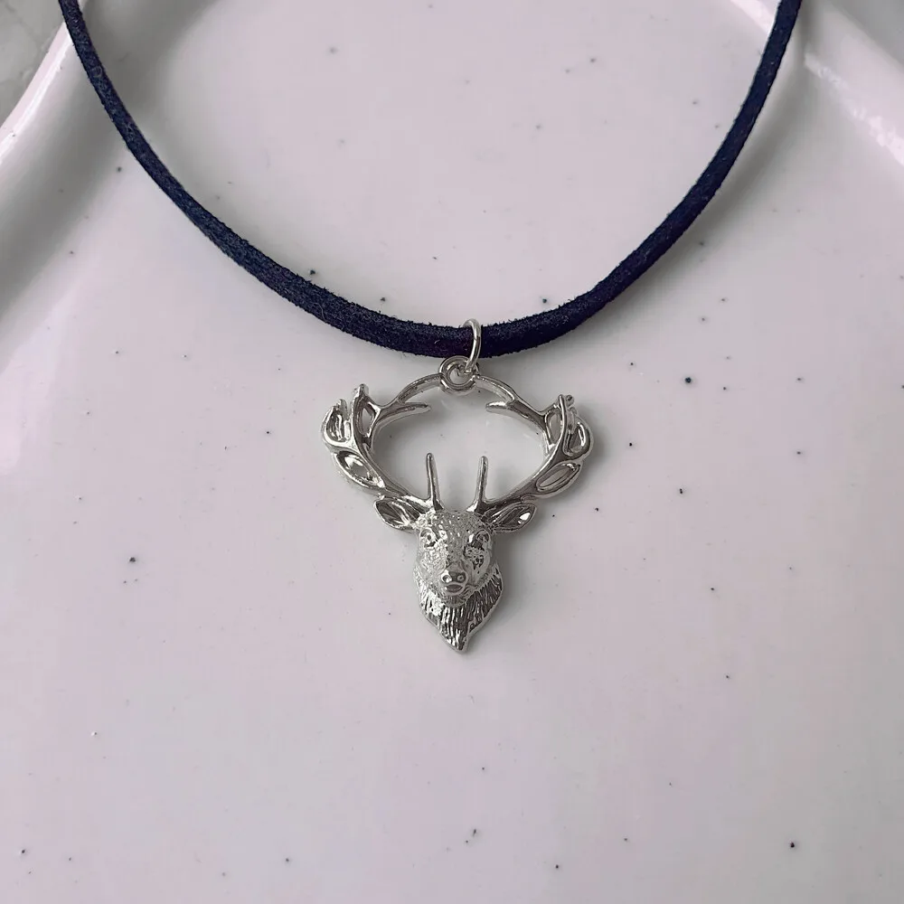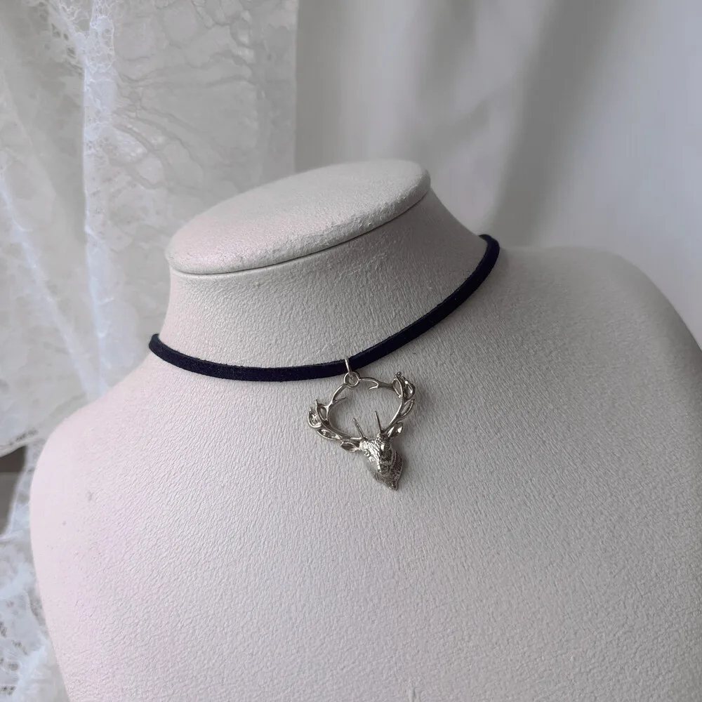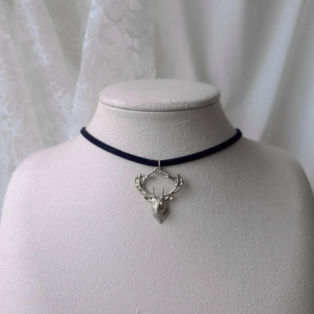 A vintage-inspired choker necklace featuring a unique deer face pendant on a chamois cord. The exquisite detail of the pendant creates an elevated, luxurious aesthetic.