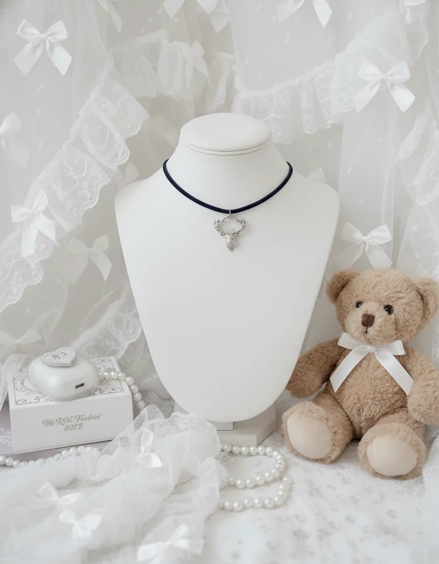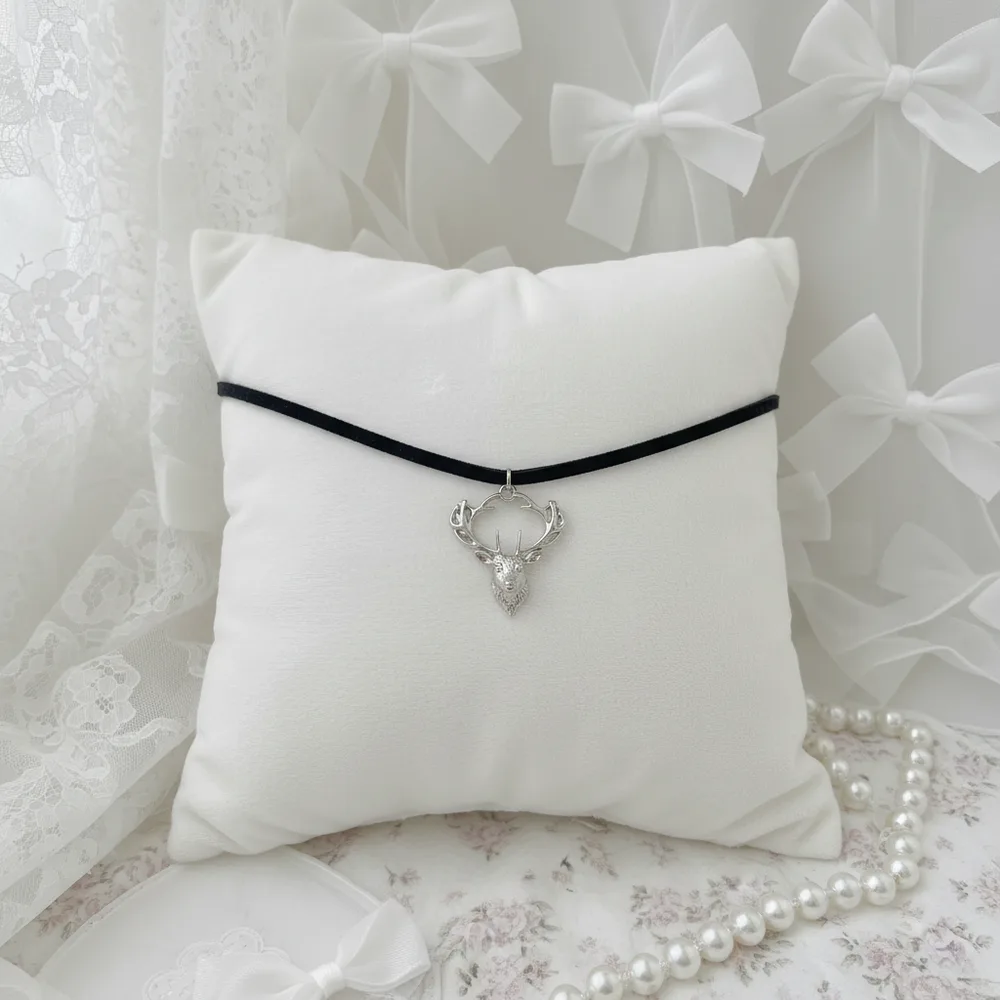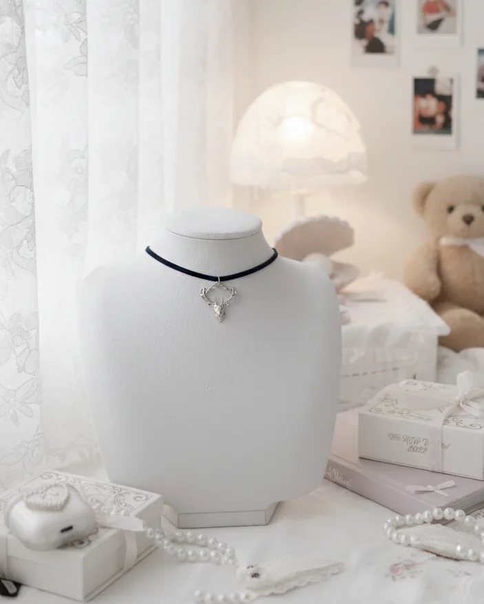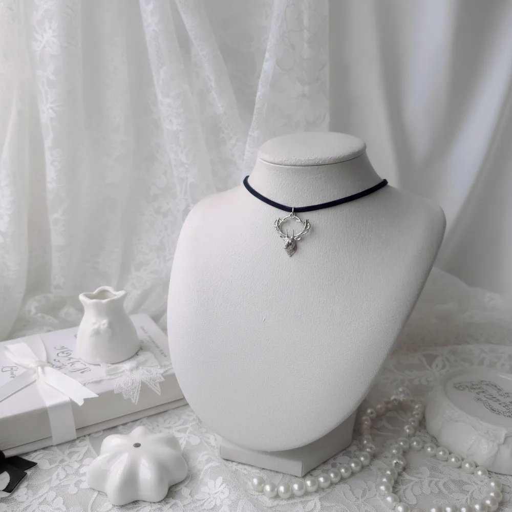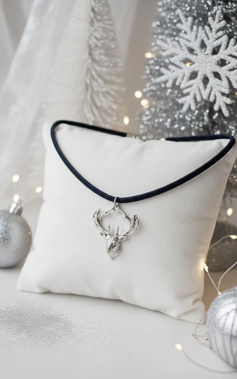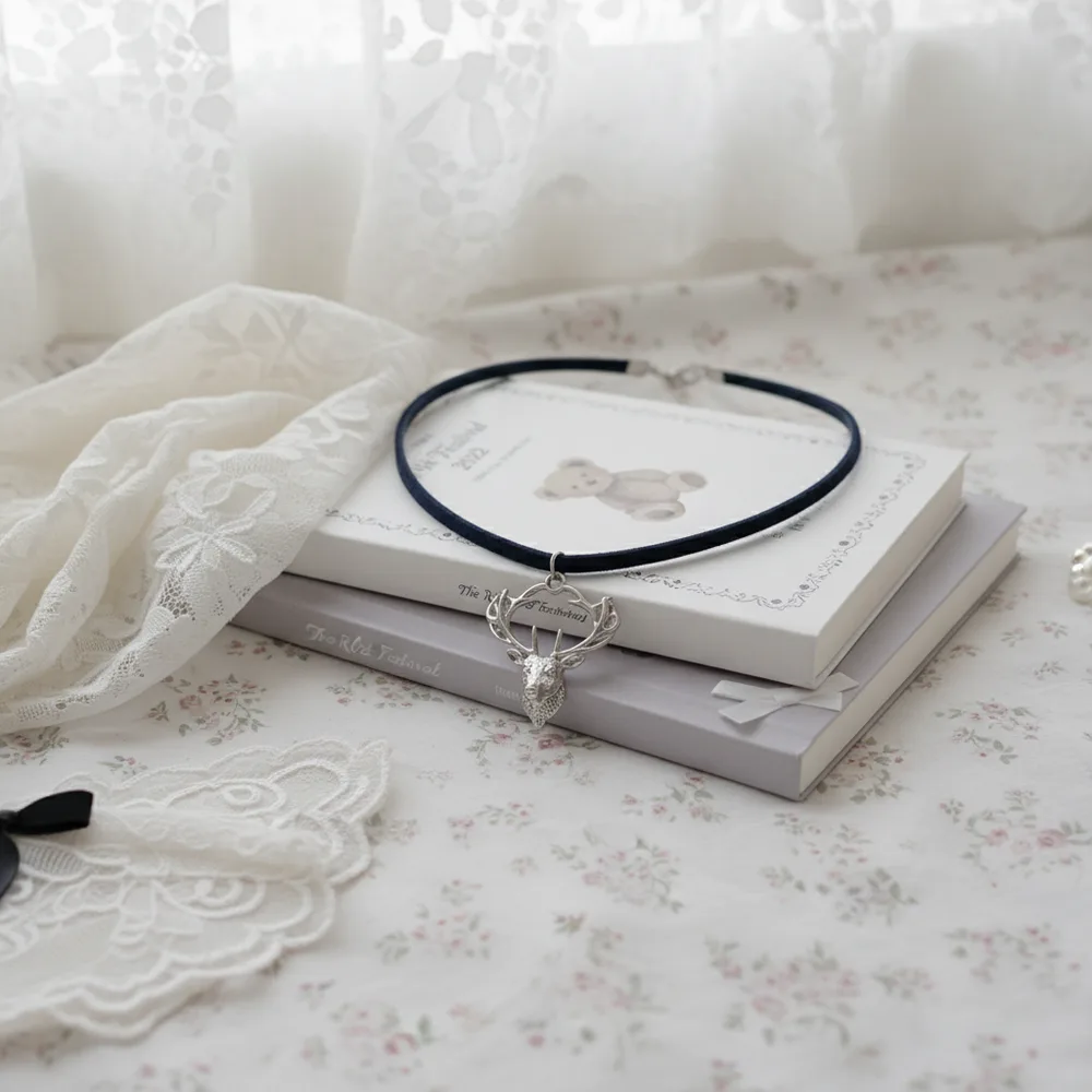 A vintage-inspired choker necklace featuring a unique deer face pendant on a chamois cord. The exquisite detail of the pendant creates an elevated, luxurious aesthetic.