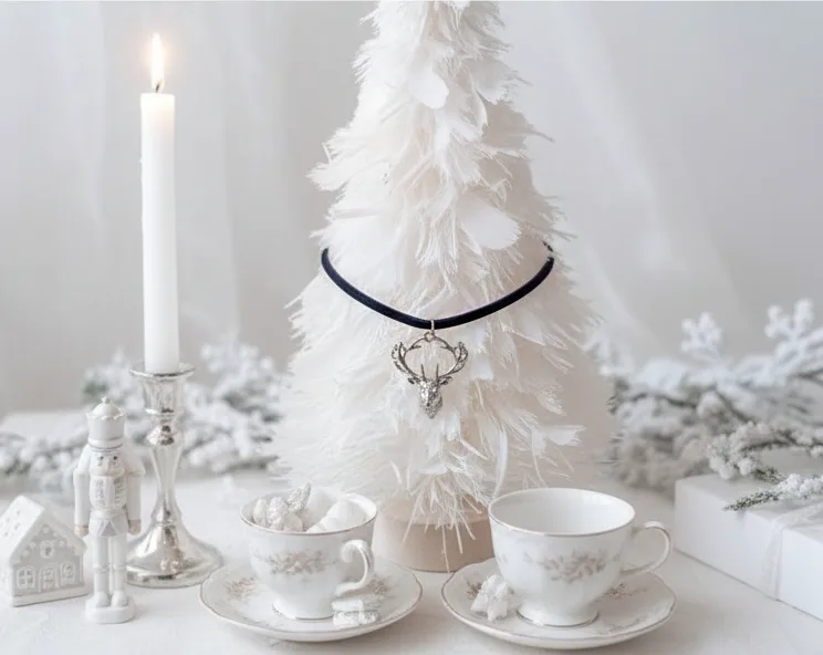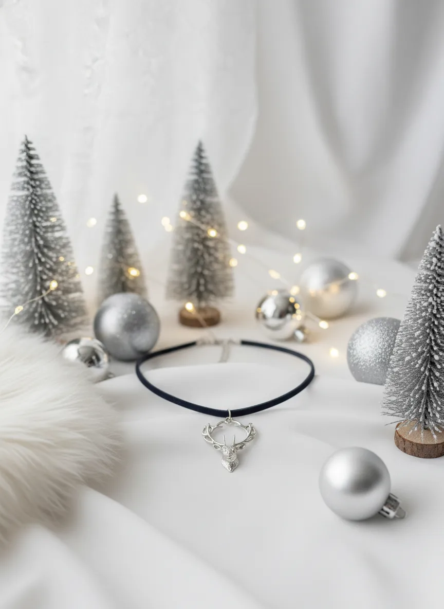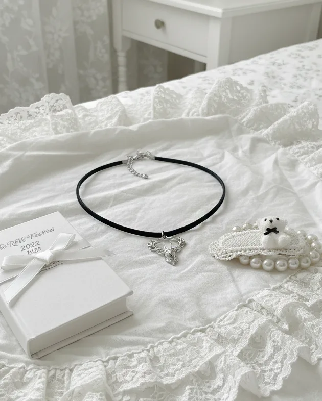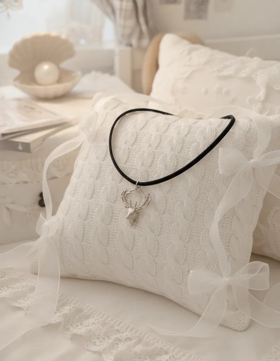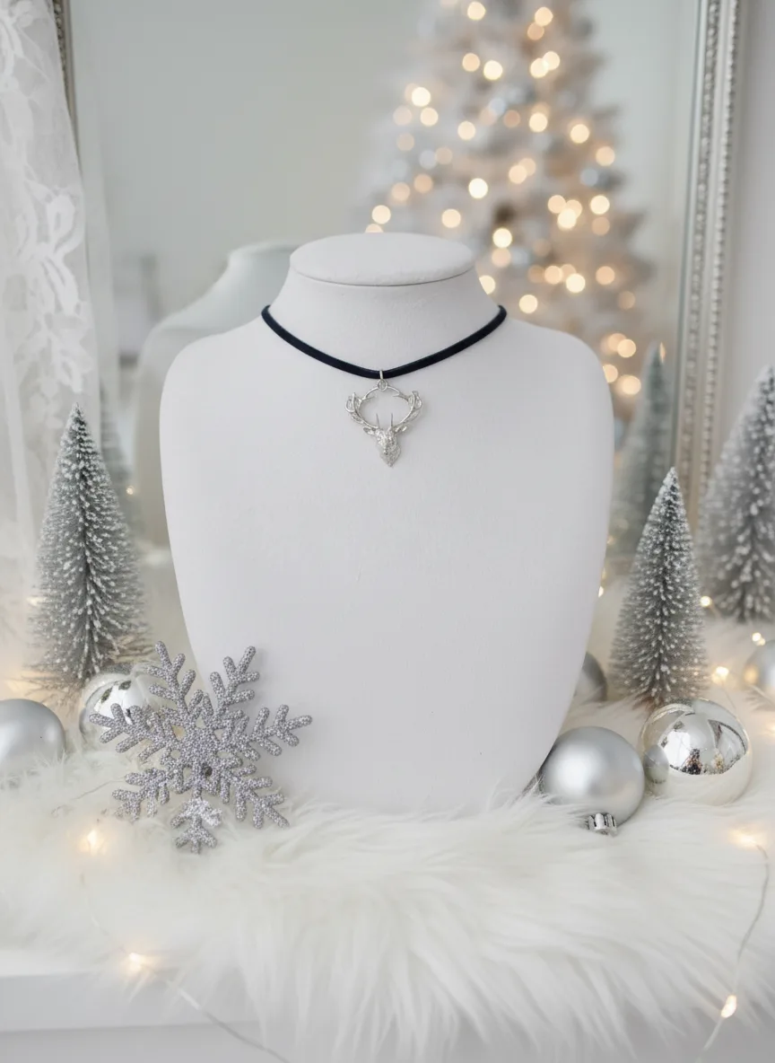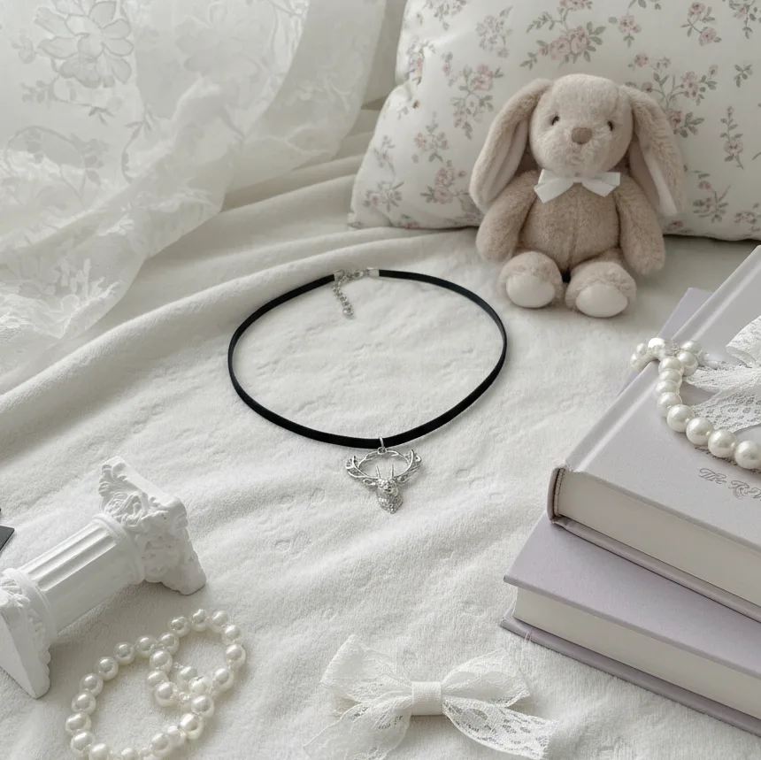A vintage-inspired choker necklace featuring a unique deer face pendant on a chamois cord. The exquisite detail of the pendant creates an elevated, luxurious aesthetic.