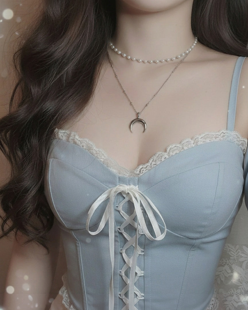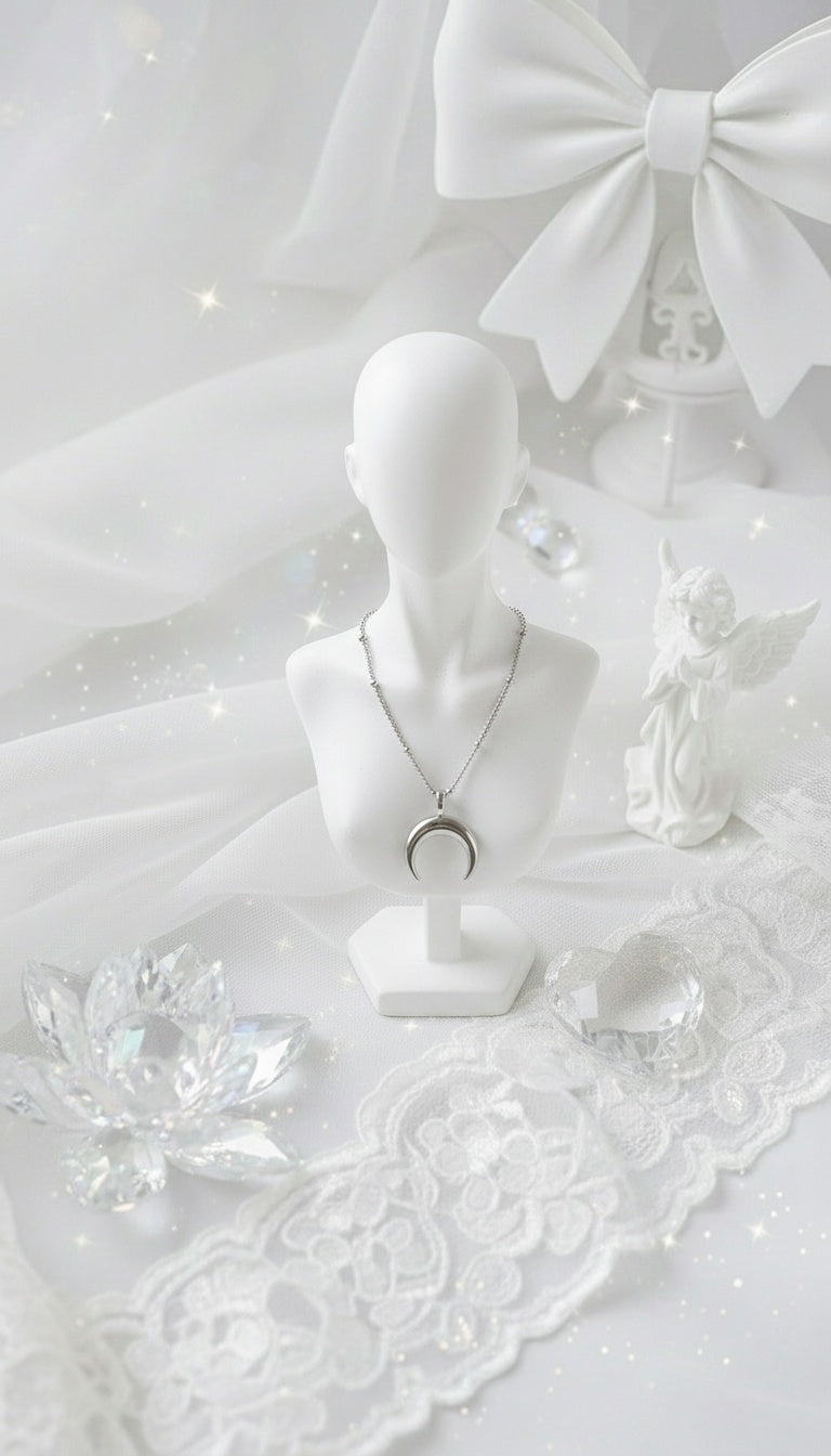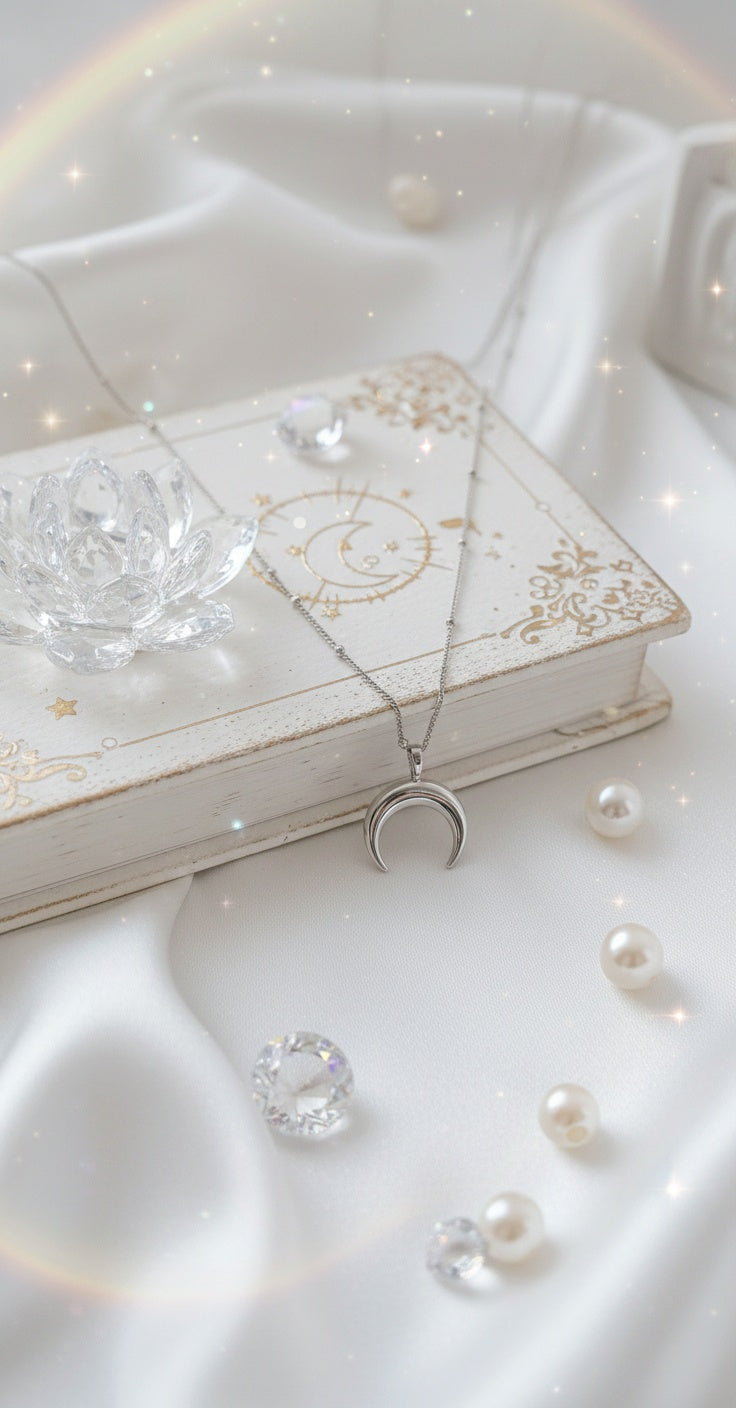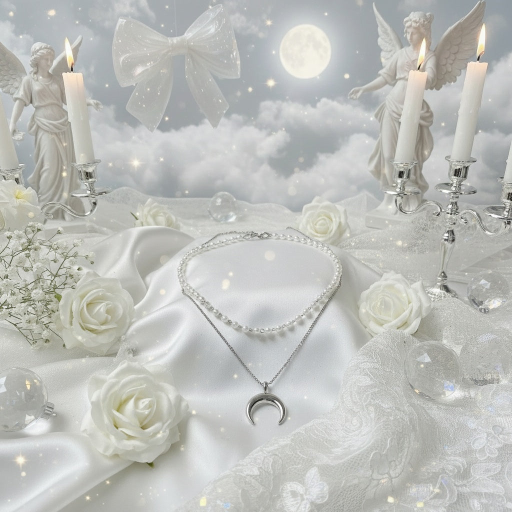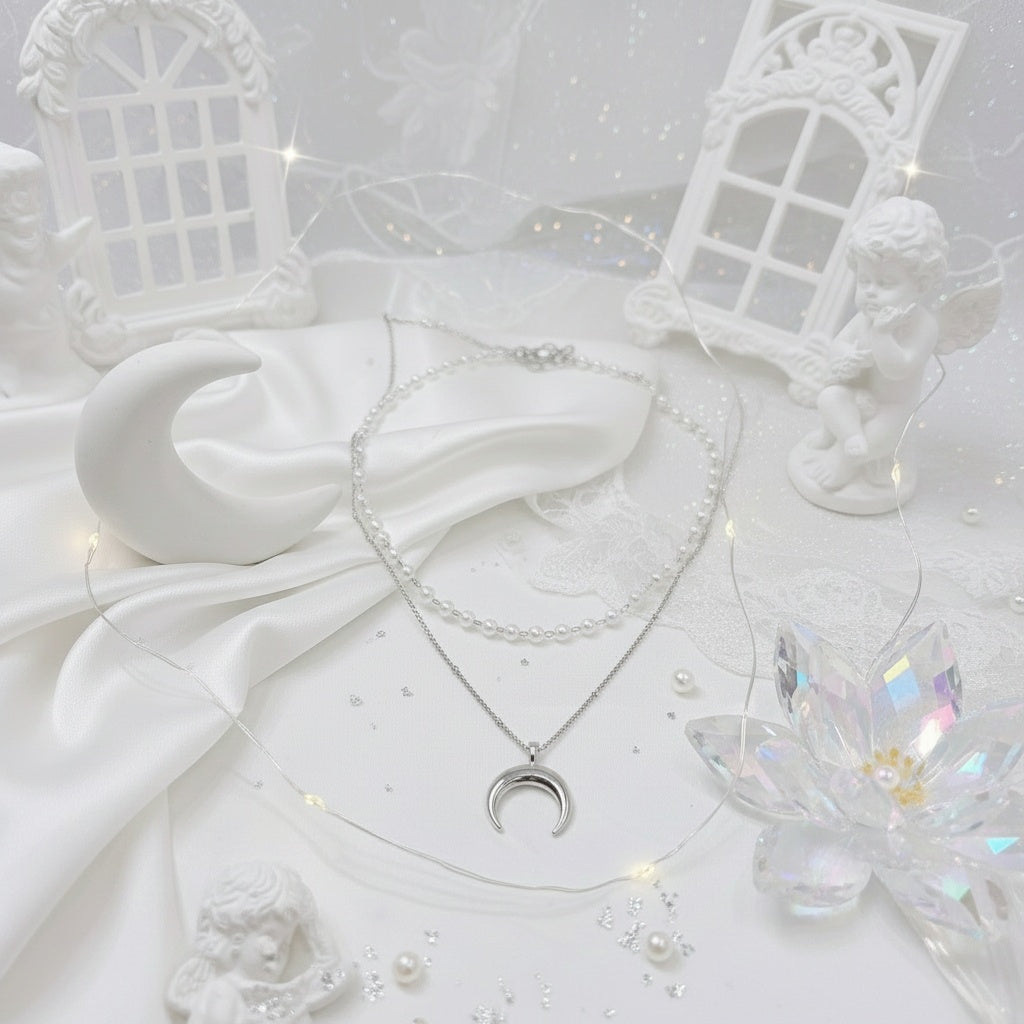 A dainty layered necklace set with a shorter pearl necklace and a chain necklace with a crescent moon pendant. The moon shape is upside-down, which makes this jewerly piece more unique and also bring an ethnic and magical vibe.
