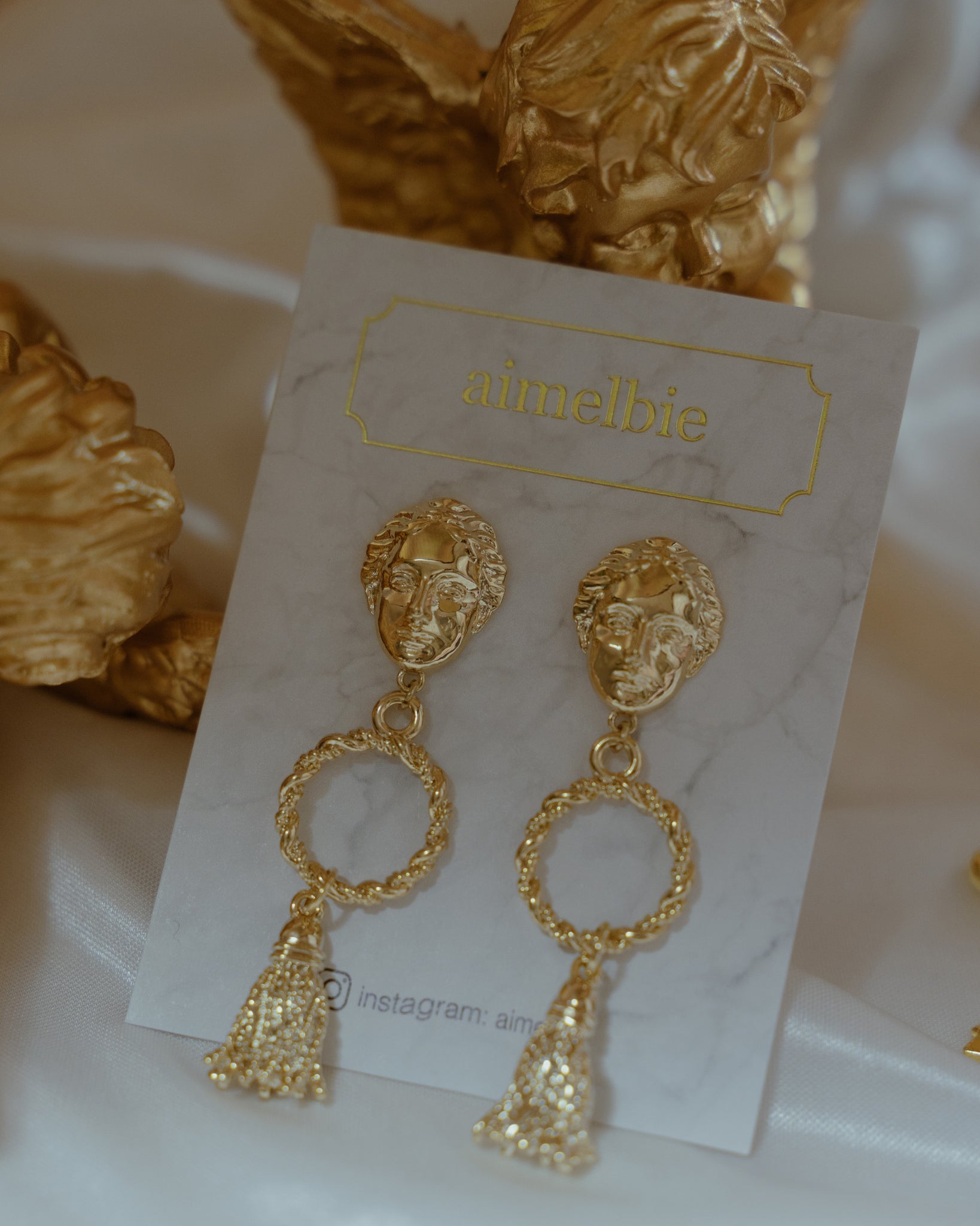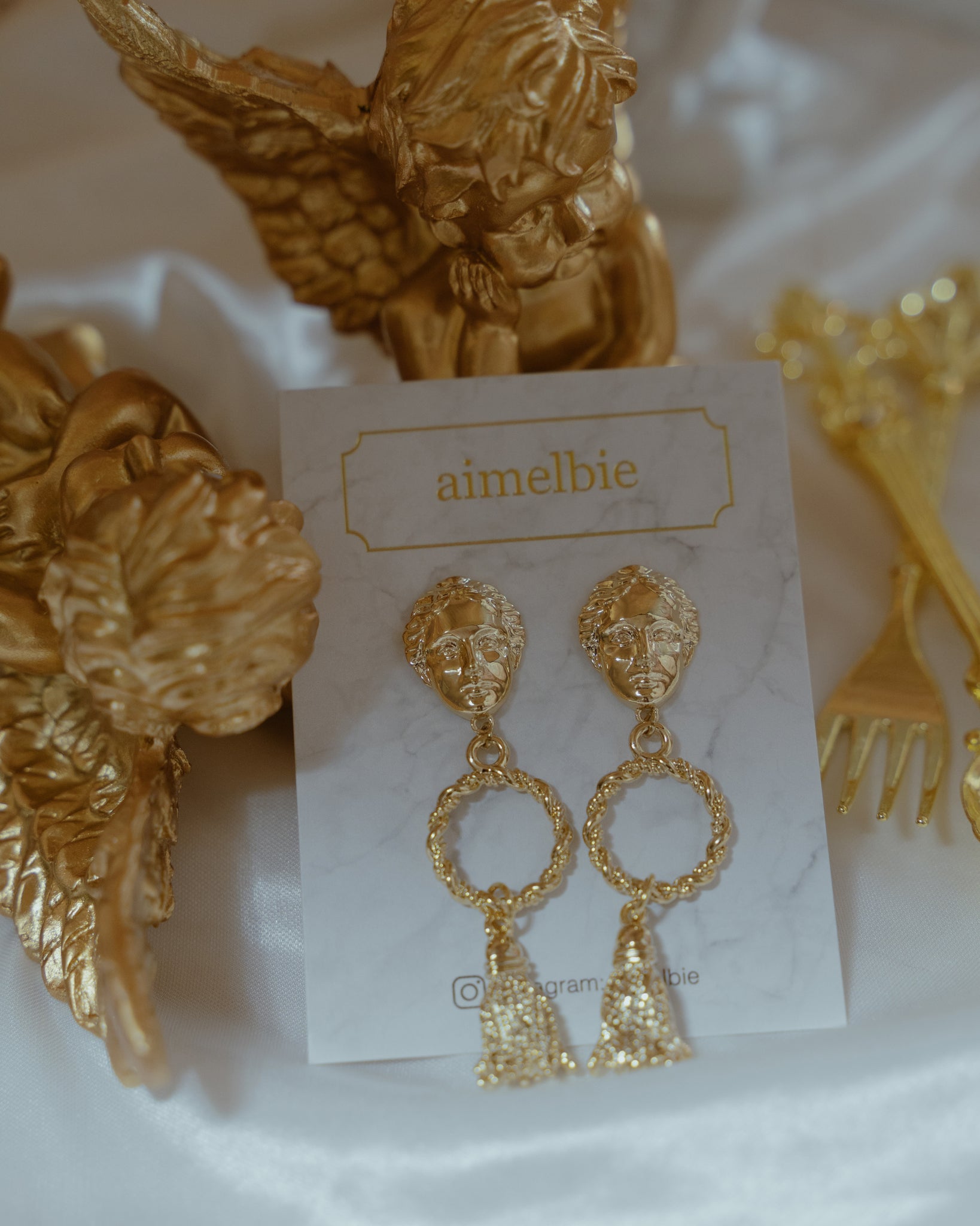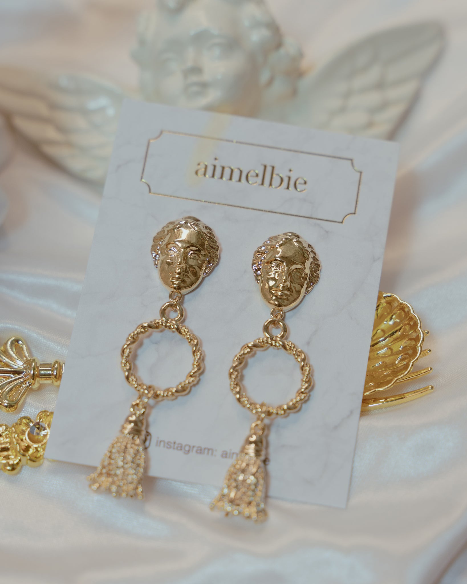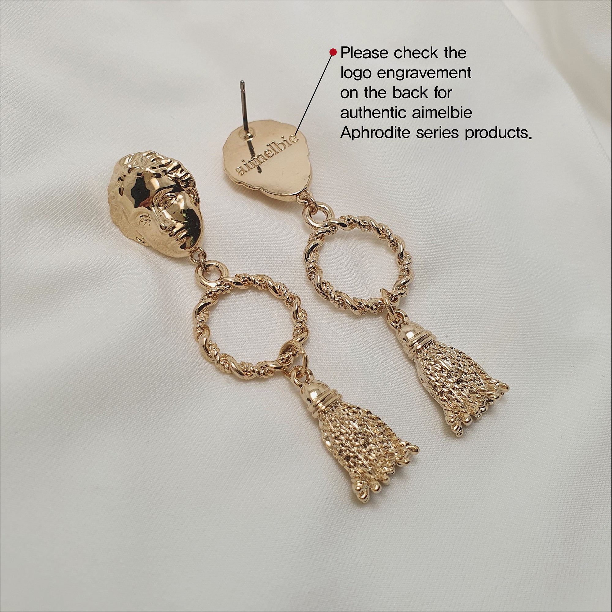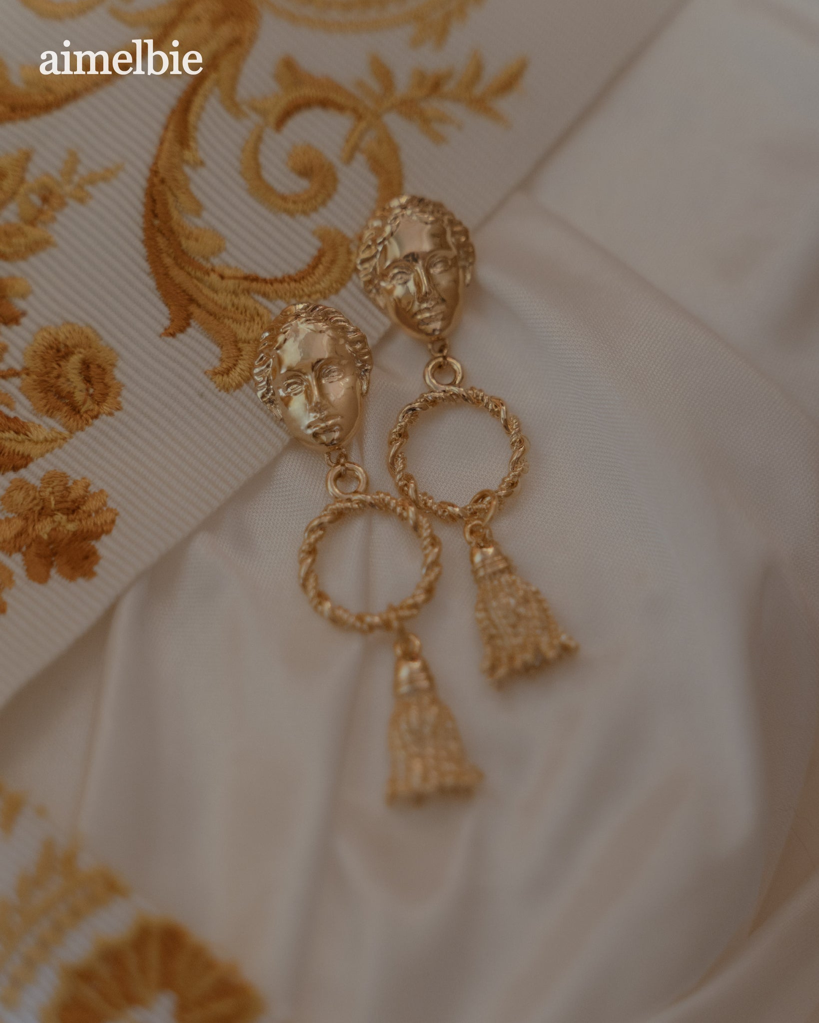 These earrings are one of 'Aphrodite Series' of aimelbie, which are inspired by the Greek goddess Aphrodite, the goddess of beauty. The post parts are in shapes of the face of Aphrodite, which resemble the ancient Greek statue. Dangling parts are composed of rings in twisted texture and tassel-shaped pendants. These Aphrodite earrings are authentic design of aimelbie, made using 3D graphic tools. Add an elegant and antique touch to your look with these unique jewelries.