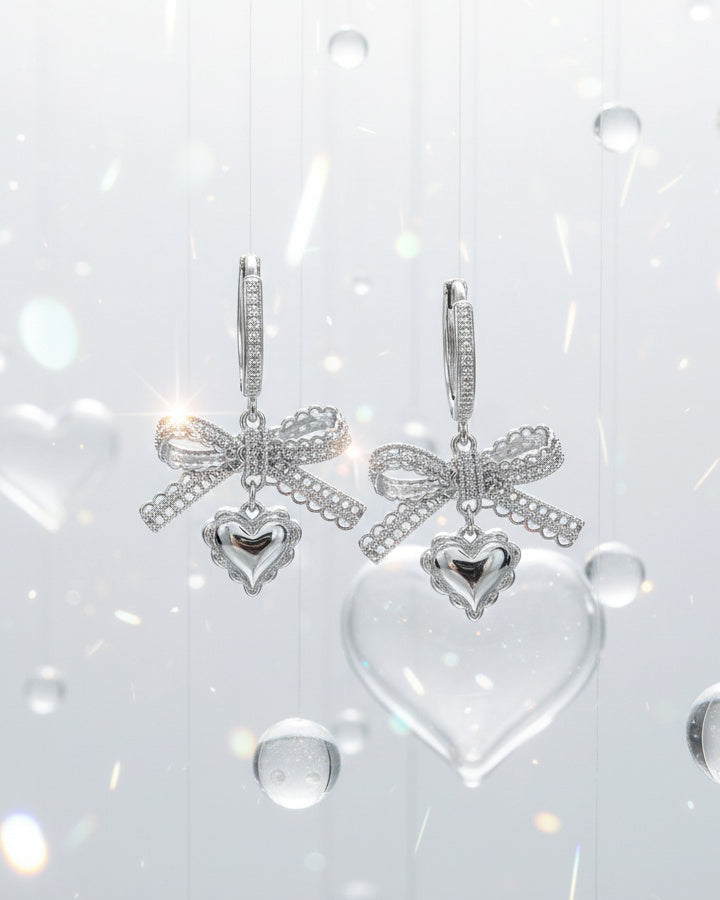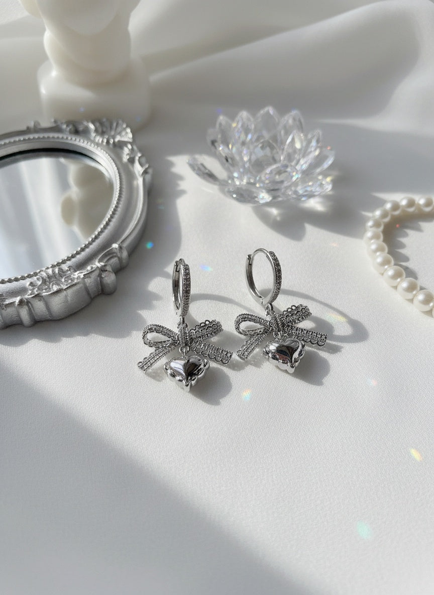 Add a touch of elegance with these one-touch earrings, featuring delicate lace-patterned ribbon accents and a heart-shaped pendant framed in lace. The hoops themselves are also embellished with shimmering cubic stones, ensuring a luxurious finish without compromise.