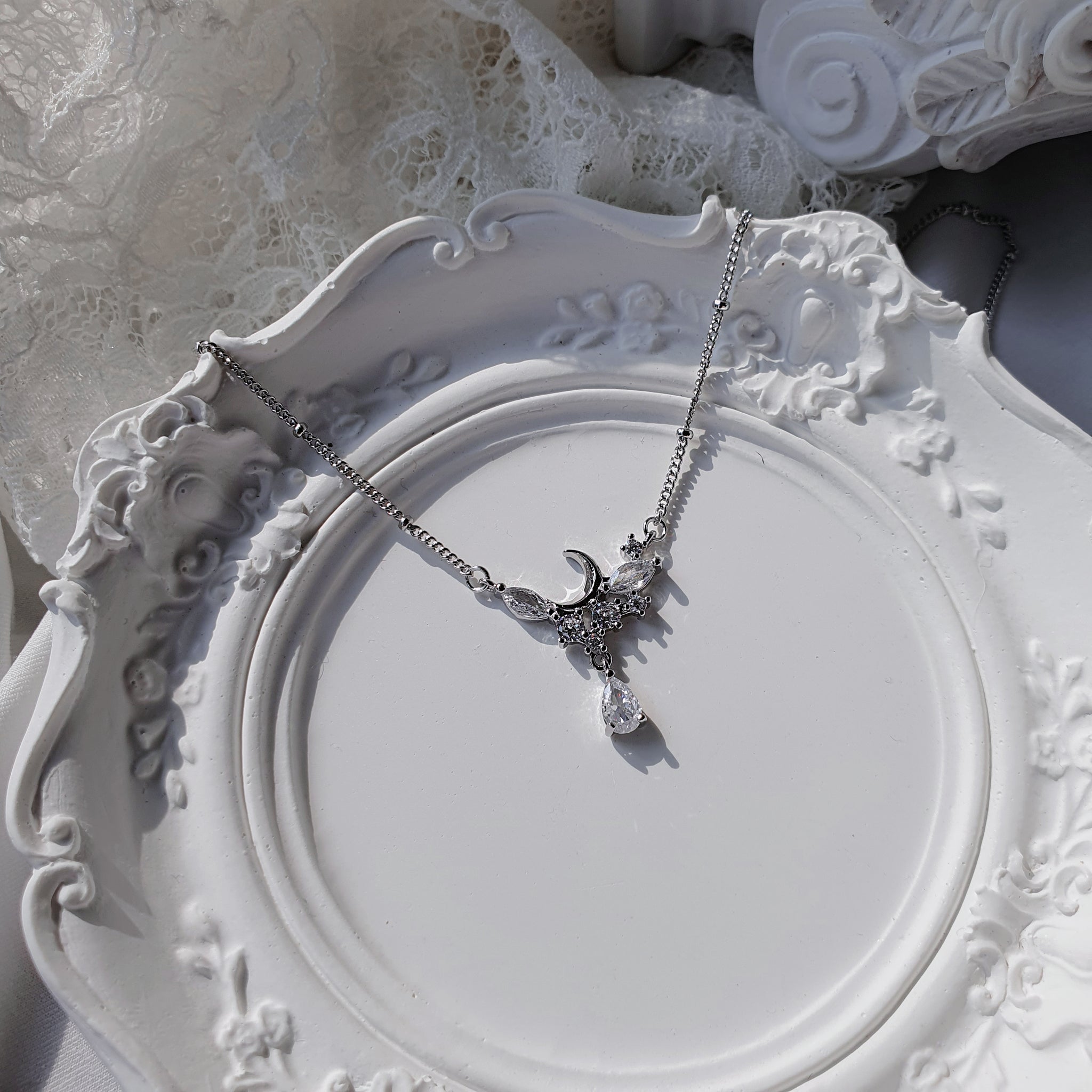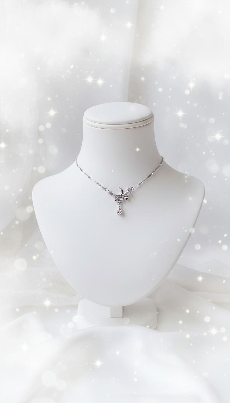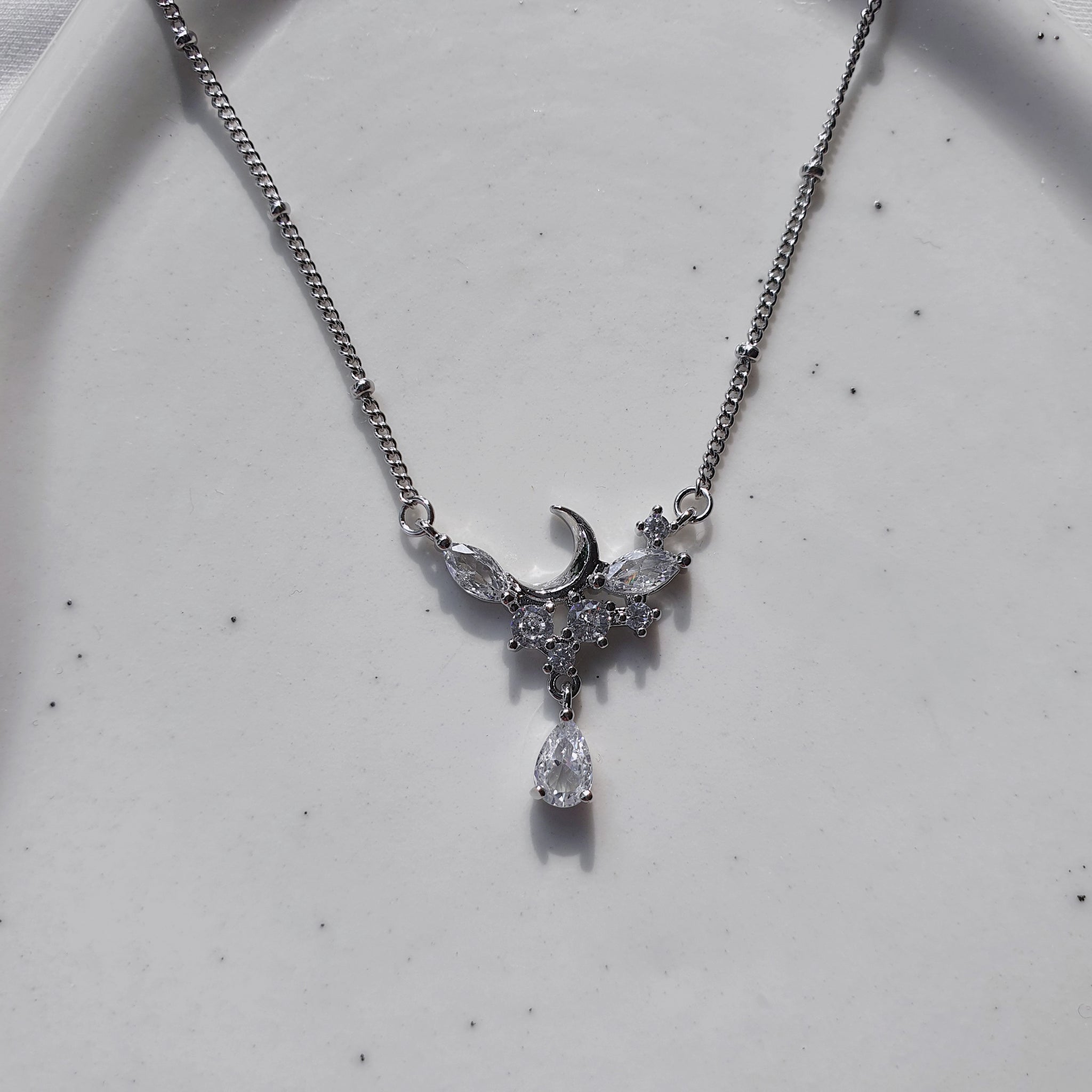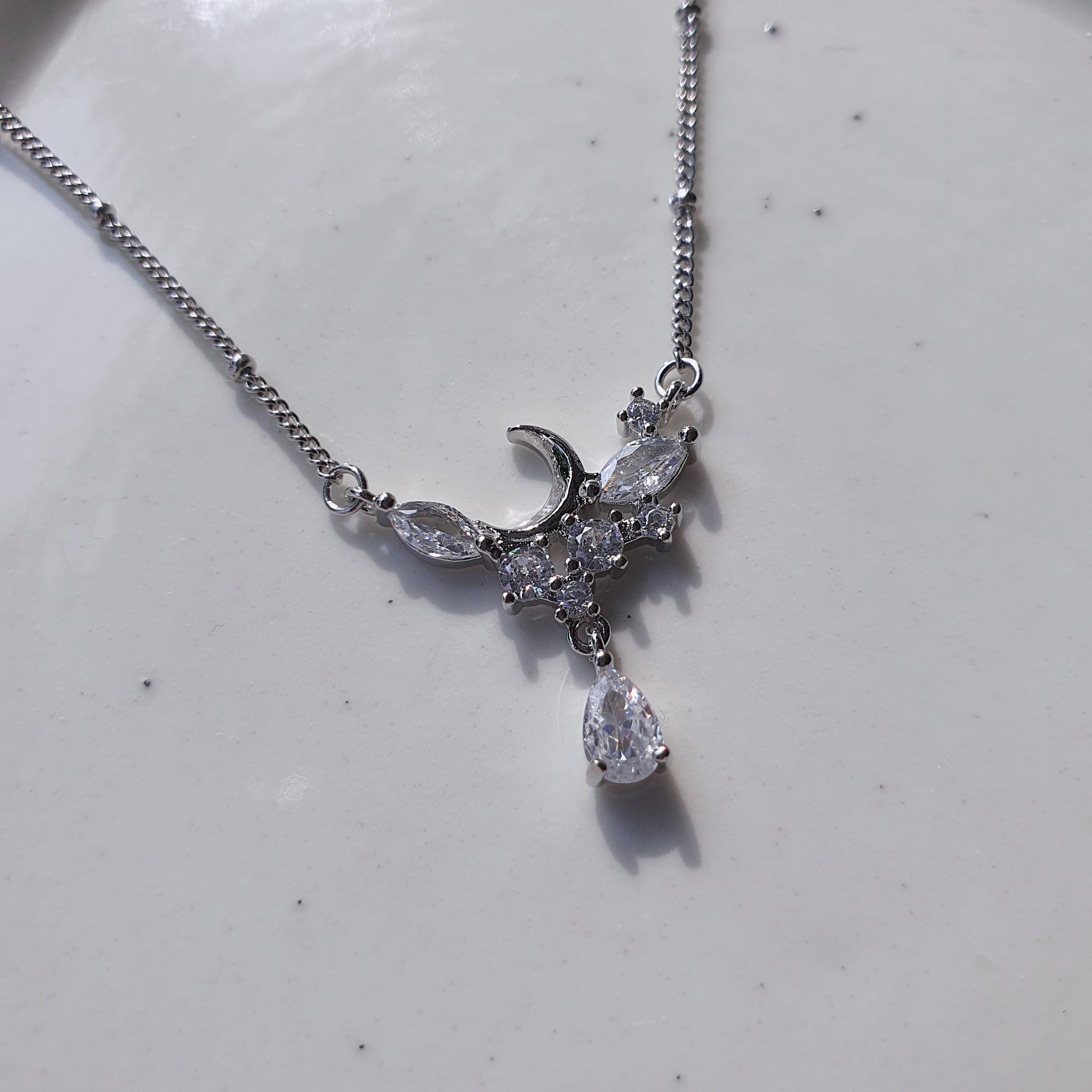 A semi-choker necklace inspired by the mystical beauty of the moon’s tears. Designed with a fairycore aesthetic, it features delicately set cubic zirconia stones that add an elegant sparkle.