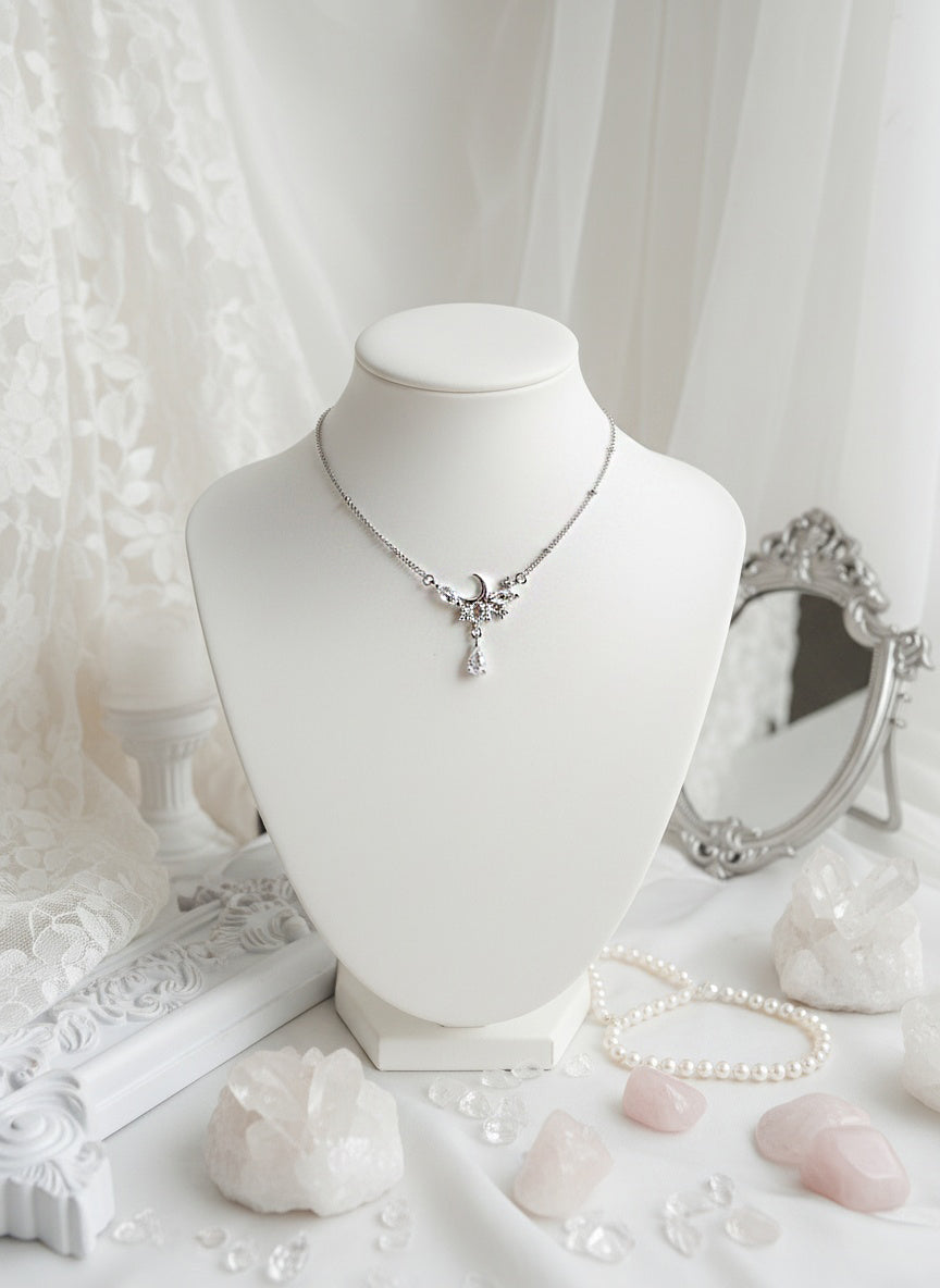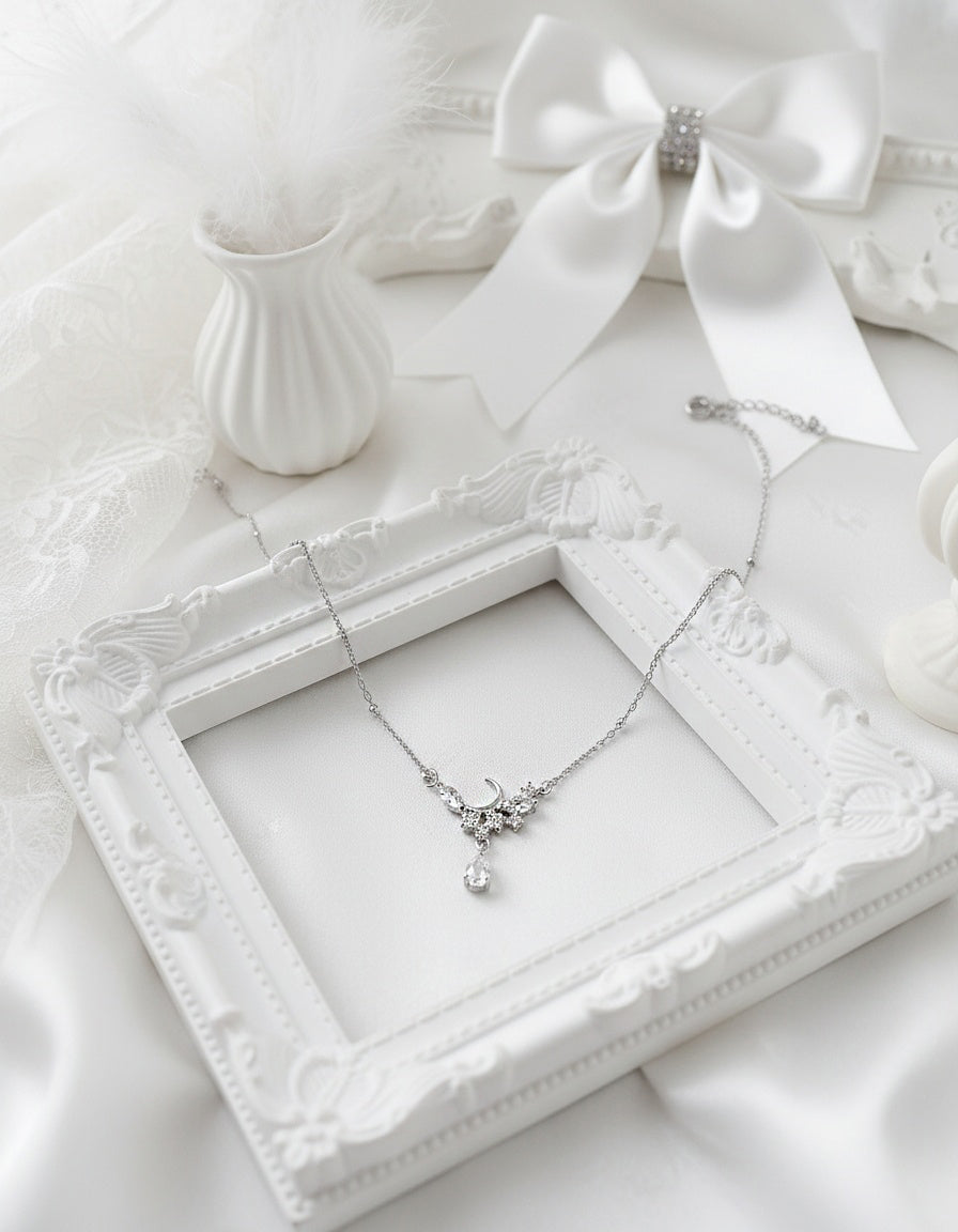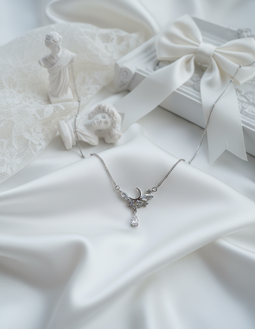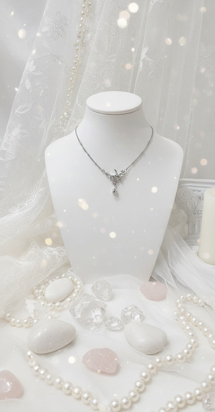 A semi-choker necklace inspired by the mystical beauty of the moon’s tears. Designed with a fairycore aesthetic, it features delicately set cubic zirconia stones that add an elegant sparkle.