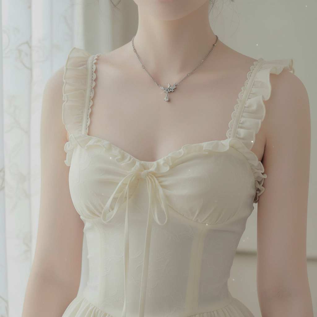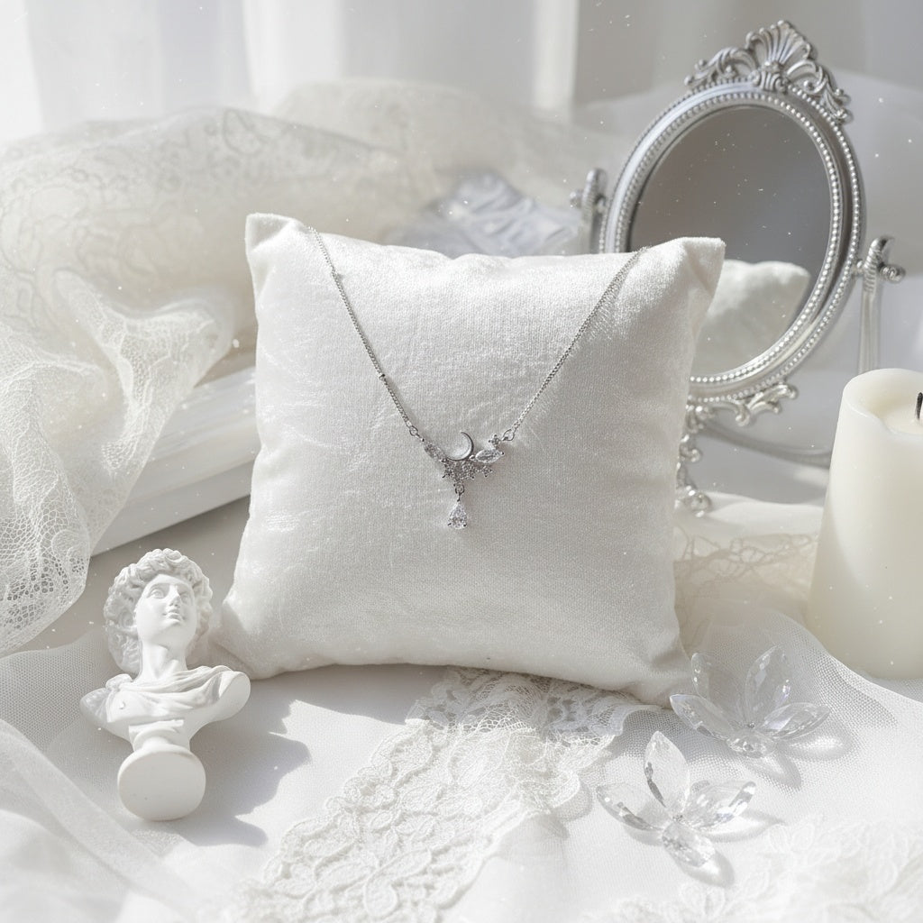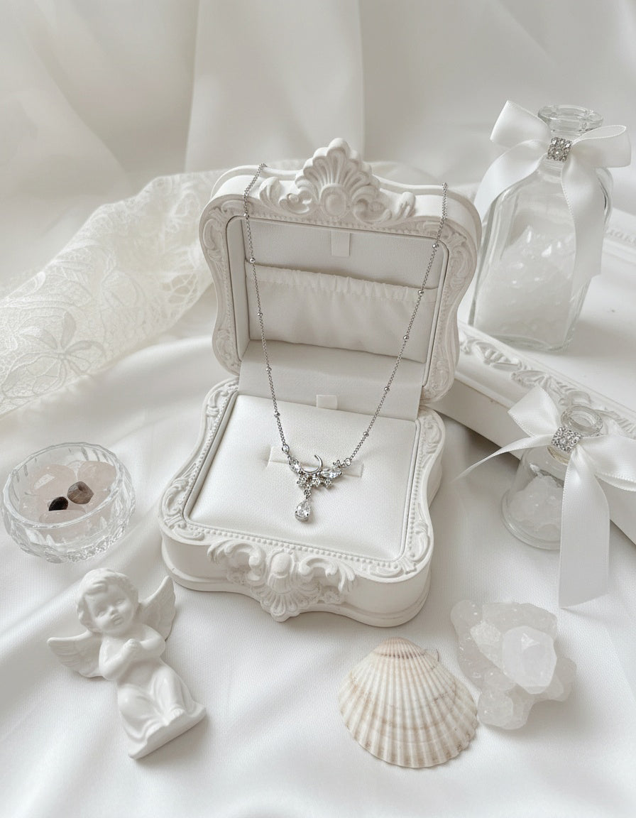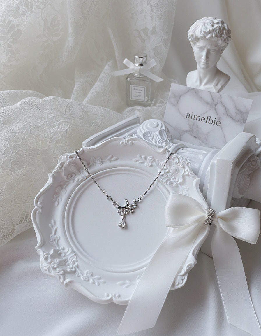 A semi-choker necklace inspired by the mystical beauty of the moon’s tears. Designed with a fairycore aesthetic, it features delicately set cubic zirconia stones that add an elegant sparkle.