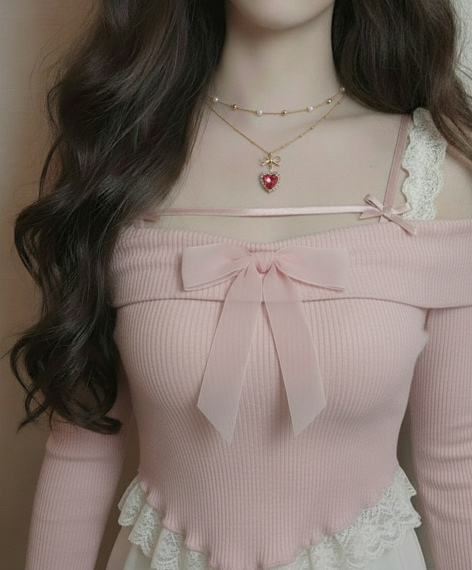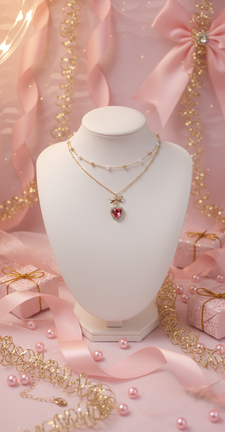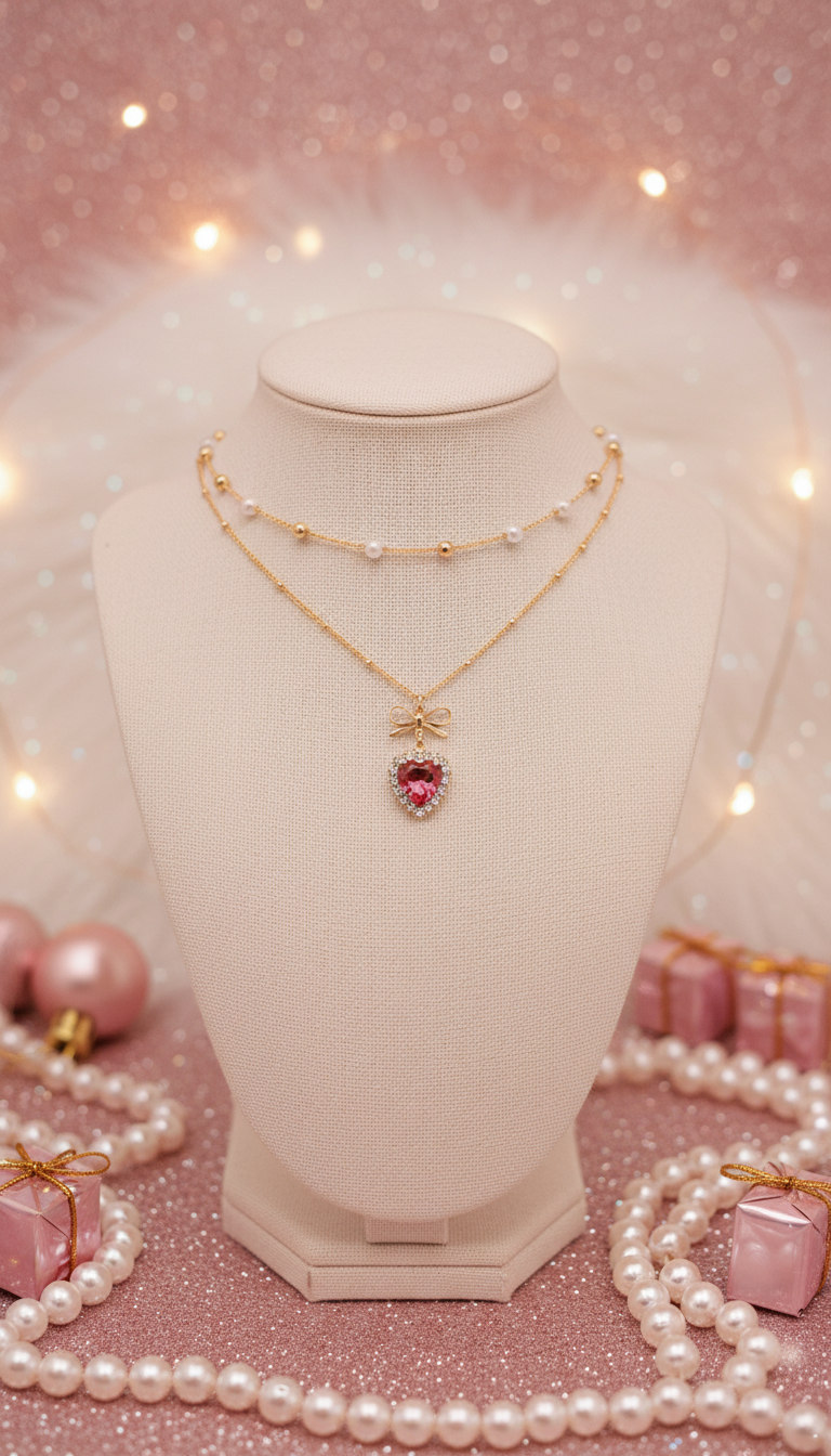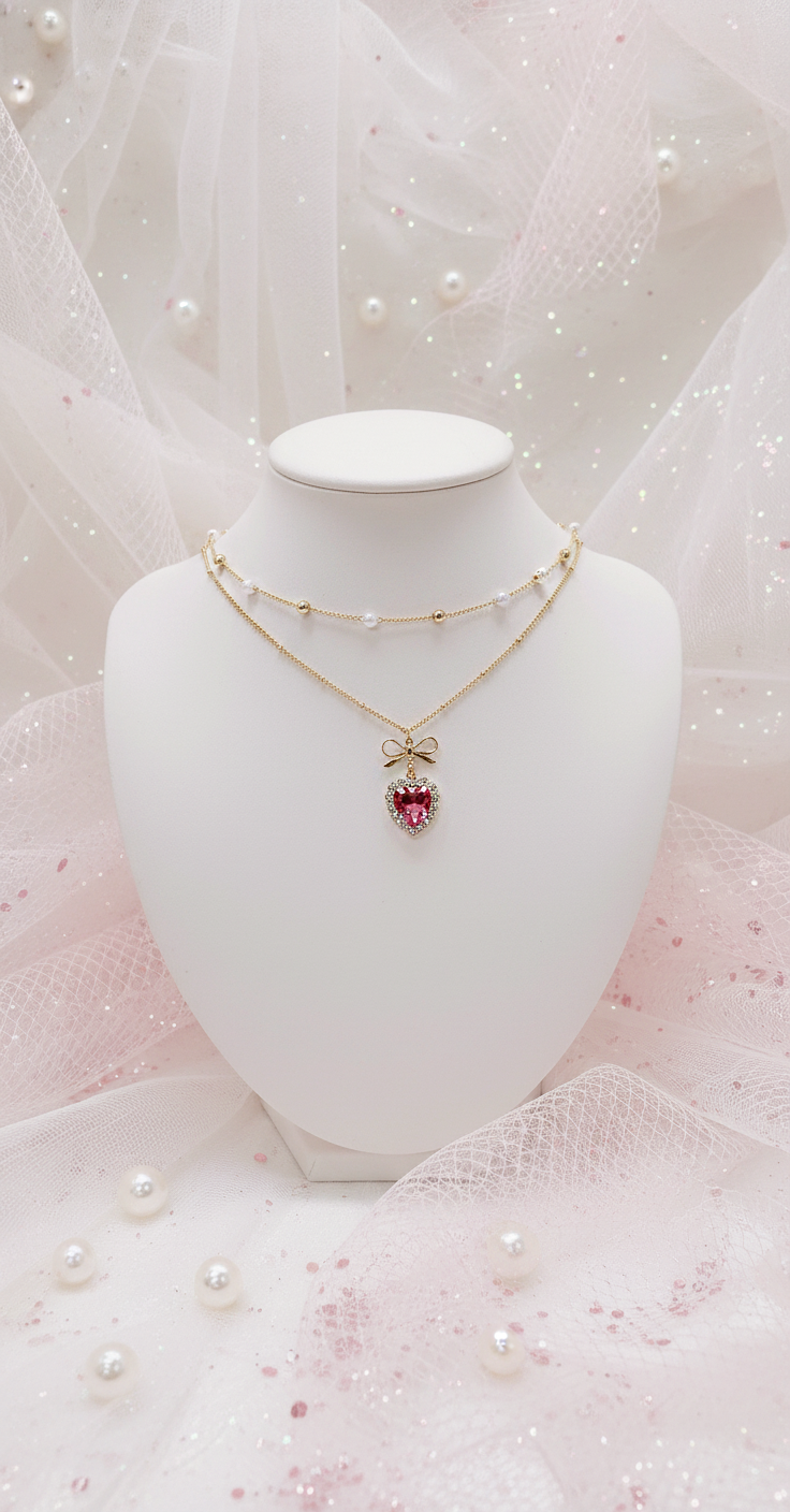 The ultimate princess style layered necklace set with a sparkling rosepink heart and a gold bow decoration! What can be lovelier?
