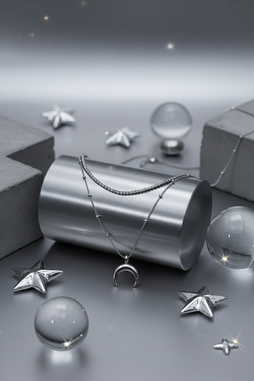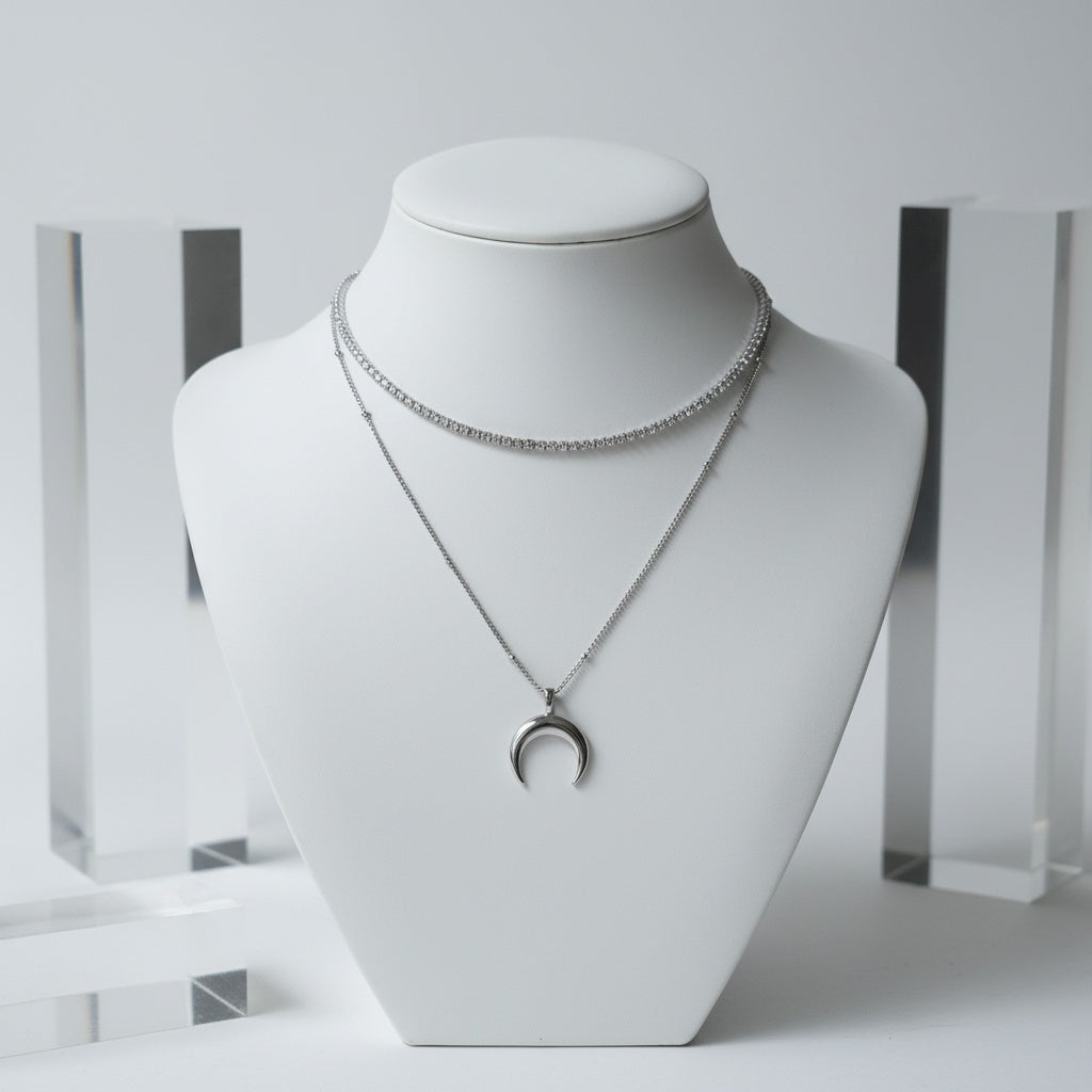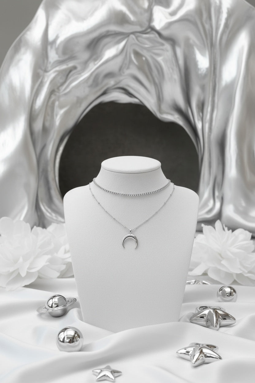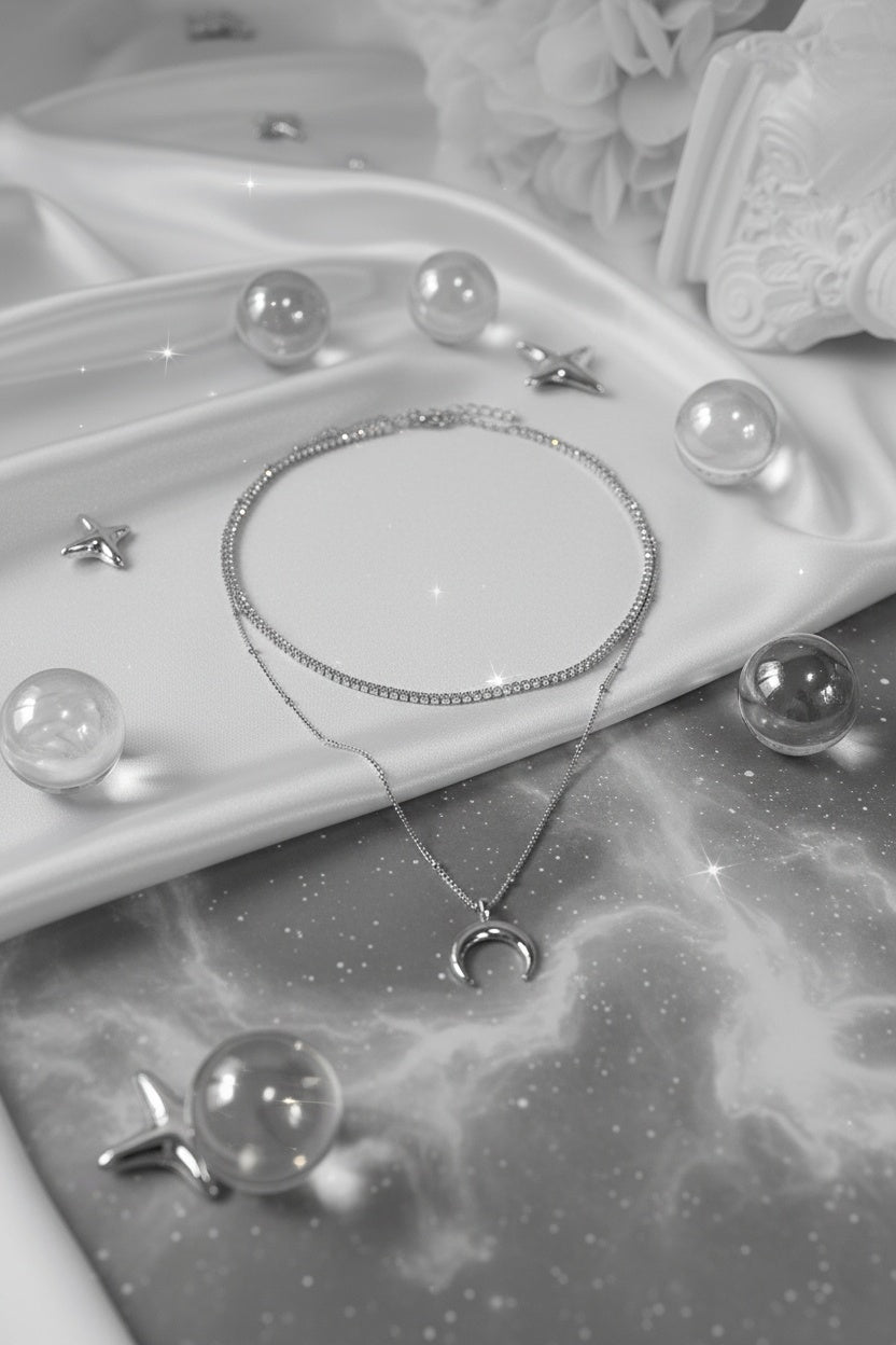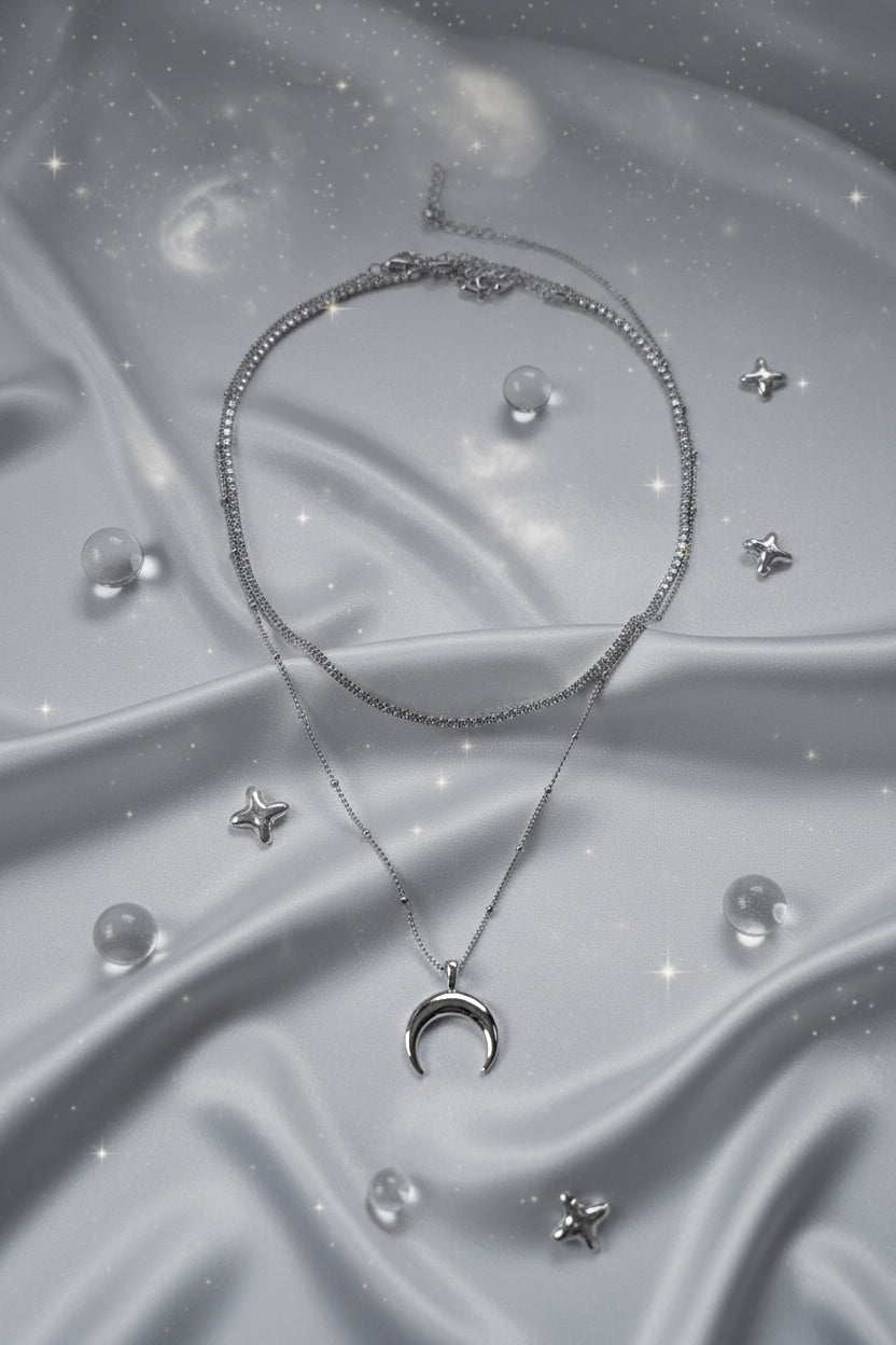 A dainty layered necklace set that consists of two individual necklaces. One is a rhinestone chain choker necklace and the other is a regular necklace that is decorated with a crescent moon pendant. The moon shape is upside-down, which makes this jewelry piece more unique and also bring an ethnic and magical vibe.