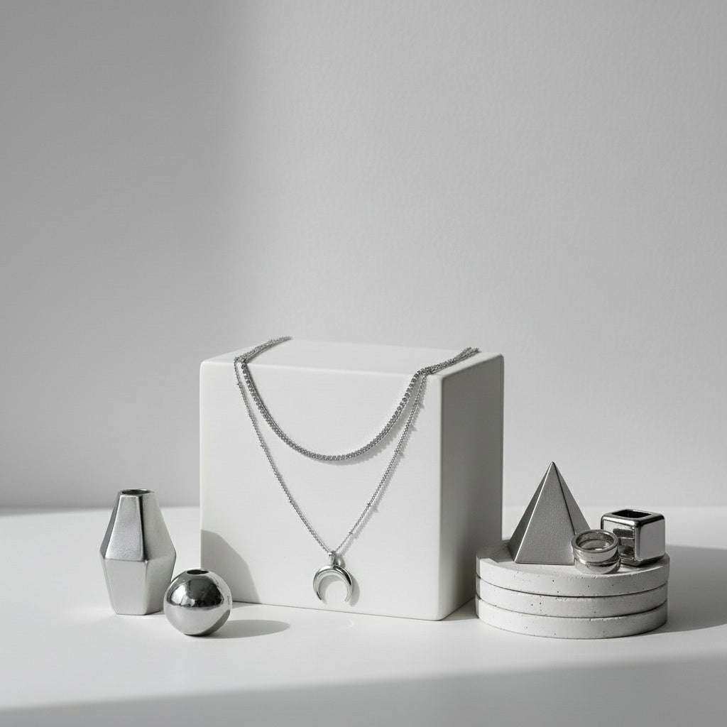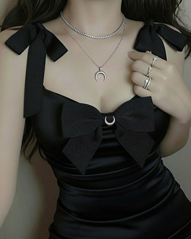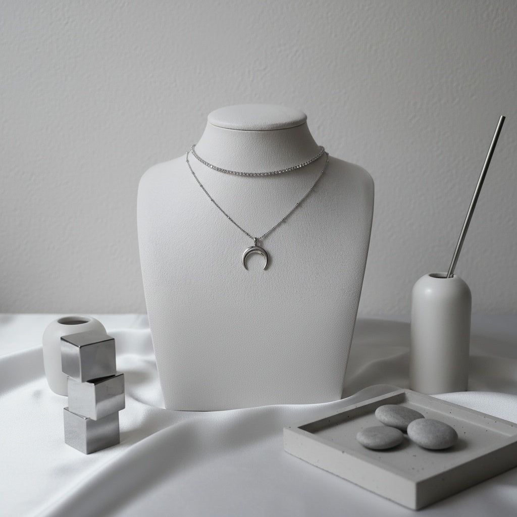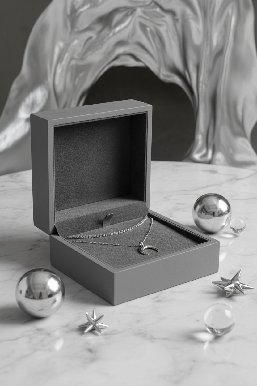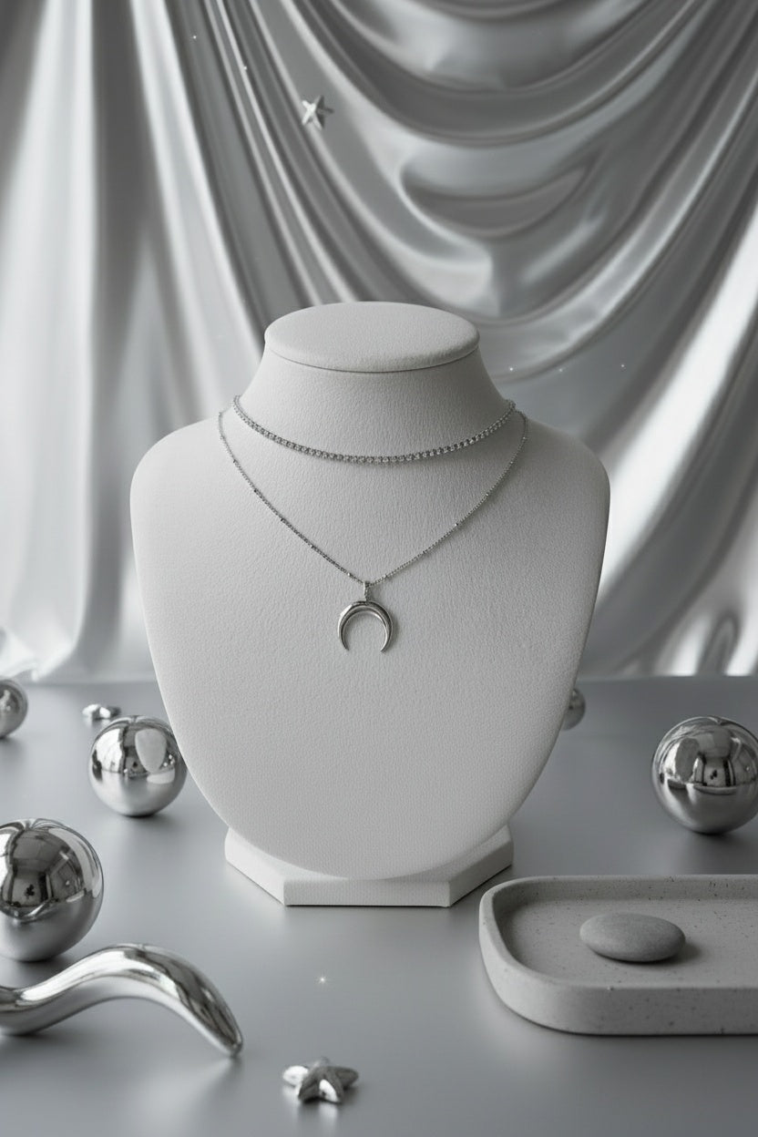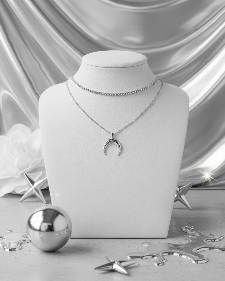 A dainty layered necklace set that consists of two individual necklaces. One is a rhinestone chain choker necklace and the other is a regular necklace that is decorated with a crescent moon pendant. The moon shape is upside-down, which makes this jewelry piece more unique and also bring an ethnic and magical vibe.