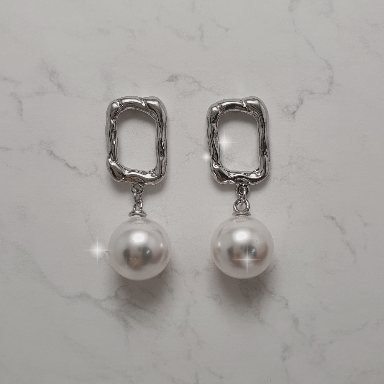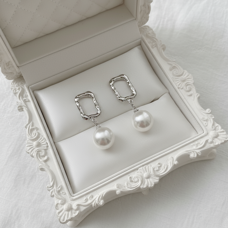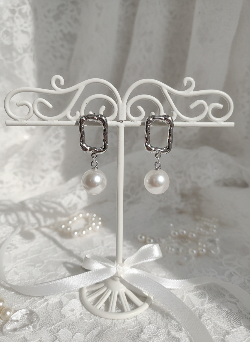 Daily simple earrings in shape of abstract rectangular silver colored rings with dangling pearls.