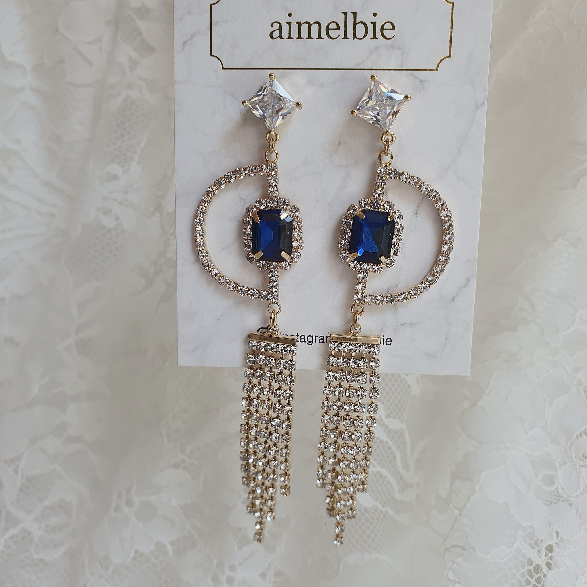 A pair of earrings that are adorned with diamond-shaped high-quality Cubic Zirconia stones, symmetric half-rings, and navy-colored crystals. Complete your urban party style with these fancy and bold statement earrings.