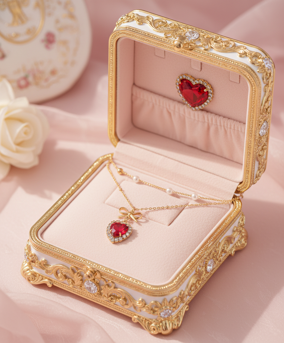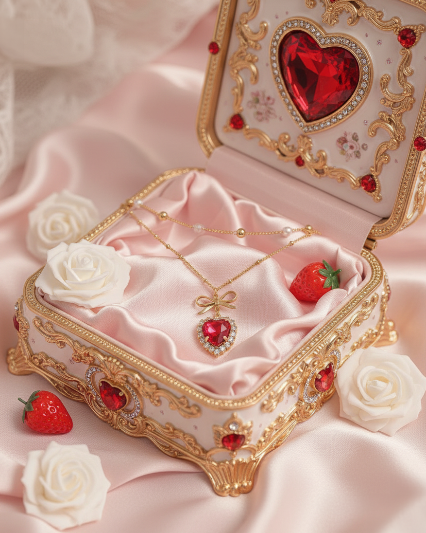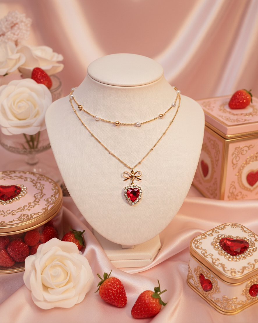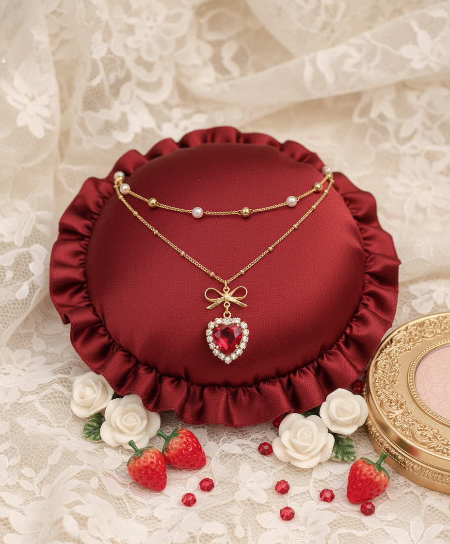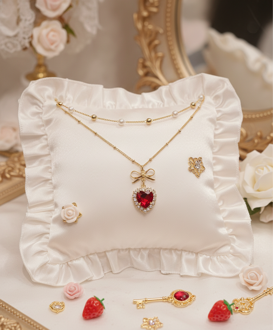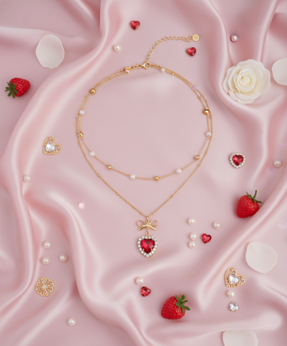 The ultimate princess style layered necklace set with a sparkling red heart and a gold bow decoration! What can be lovelier?
